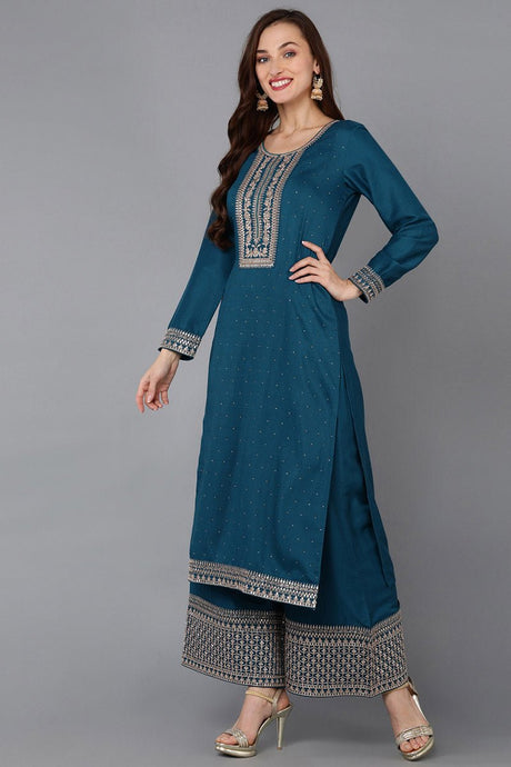 Teal Silk Blend Straight Kurti Palazzo With Dupatta