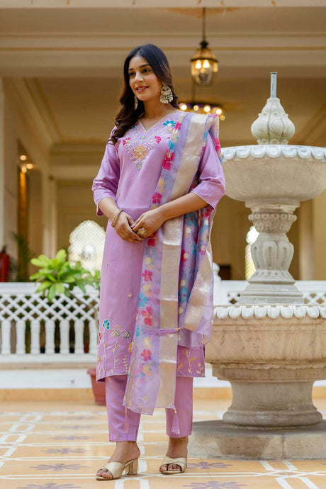 Lavender Floral Embroidered Viscose Kurti Pant Set