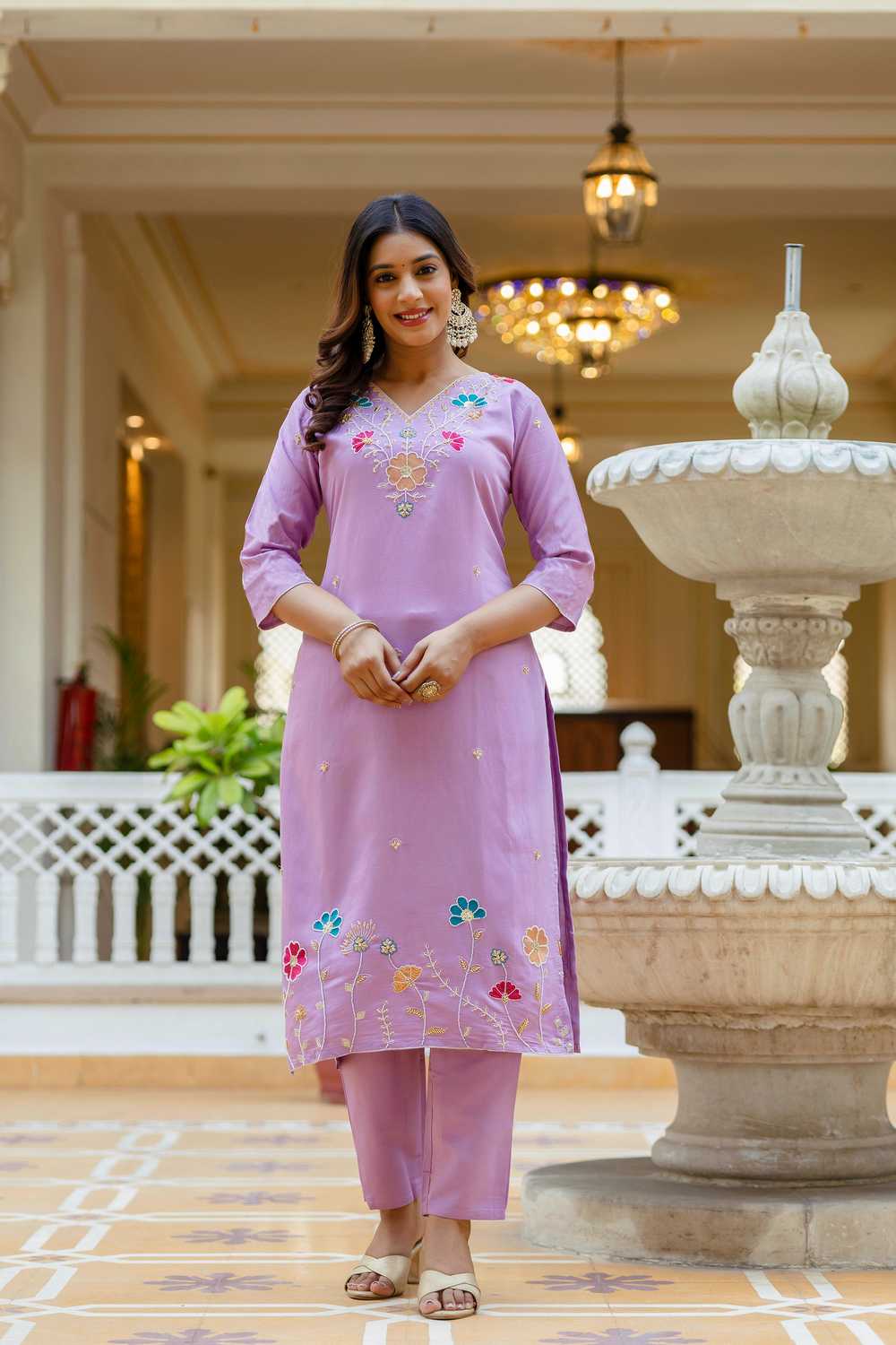 Lavender Floral Embroidered Viscose Kurti Pant Set