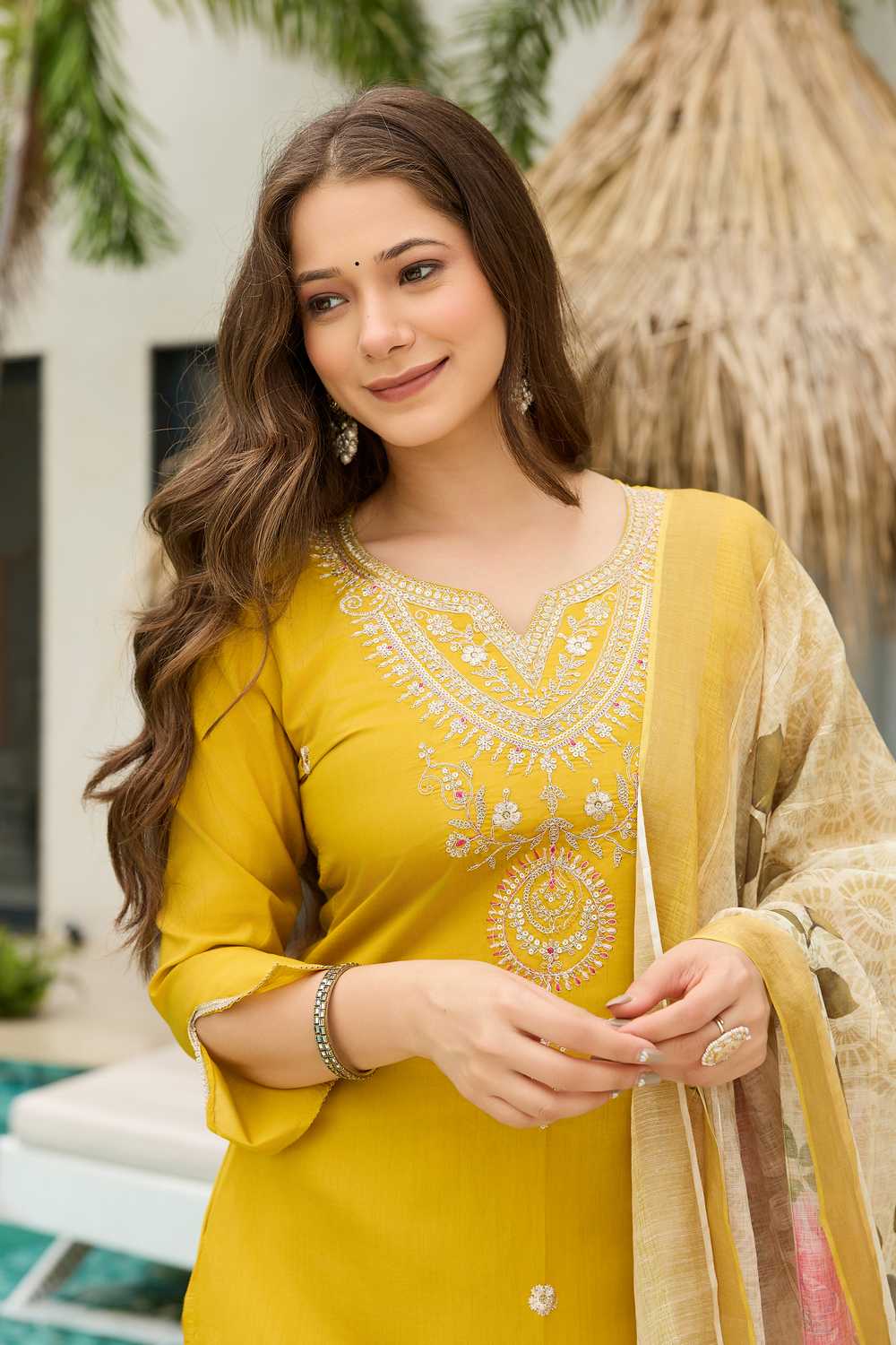 Mustard Floral Embroidered Viscose Kurti Pant Set