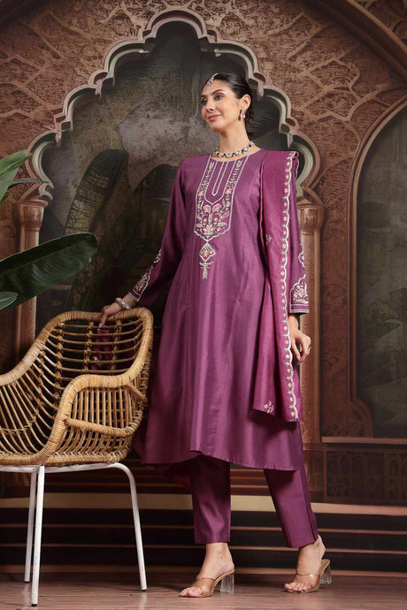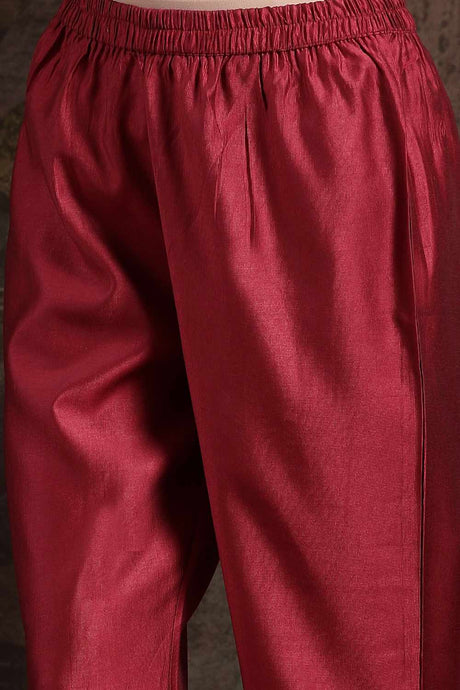 Maroon Thread Work Silk Blend Kurti Pant Set