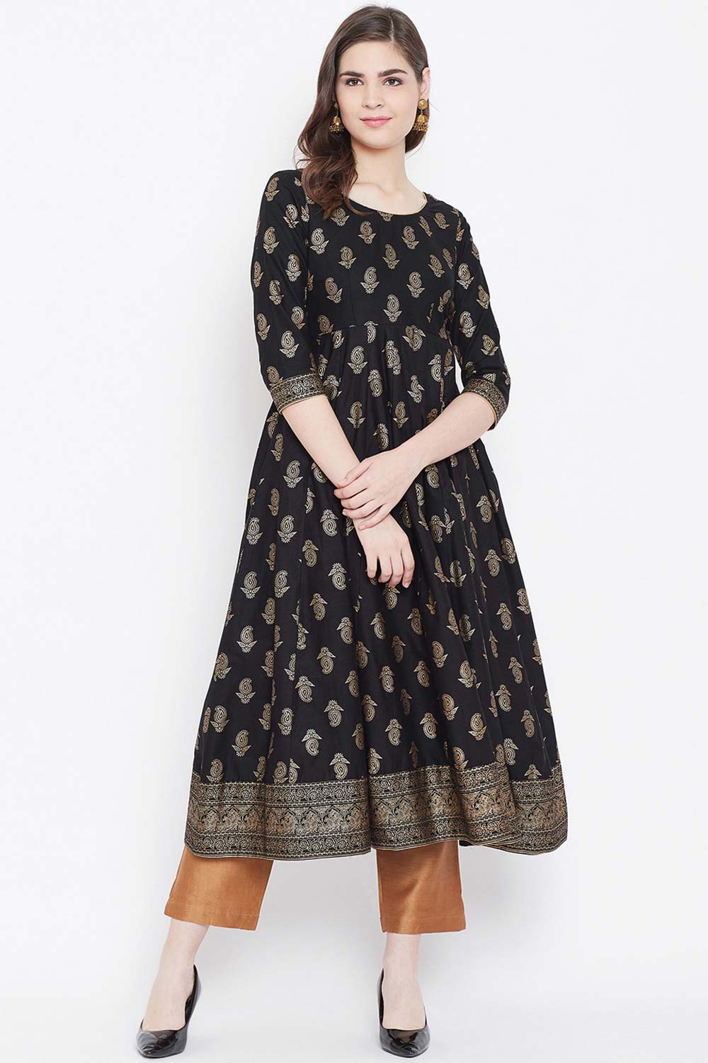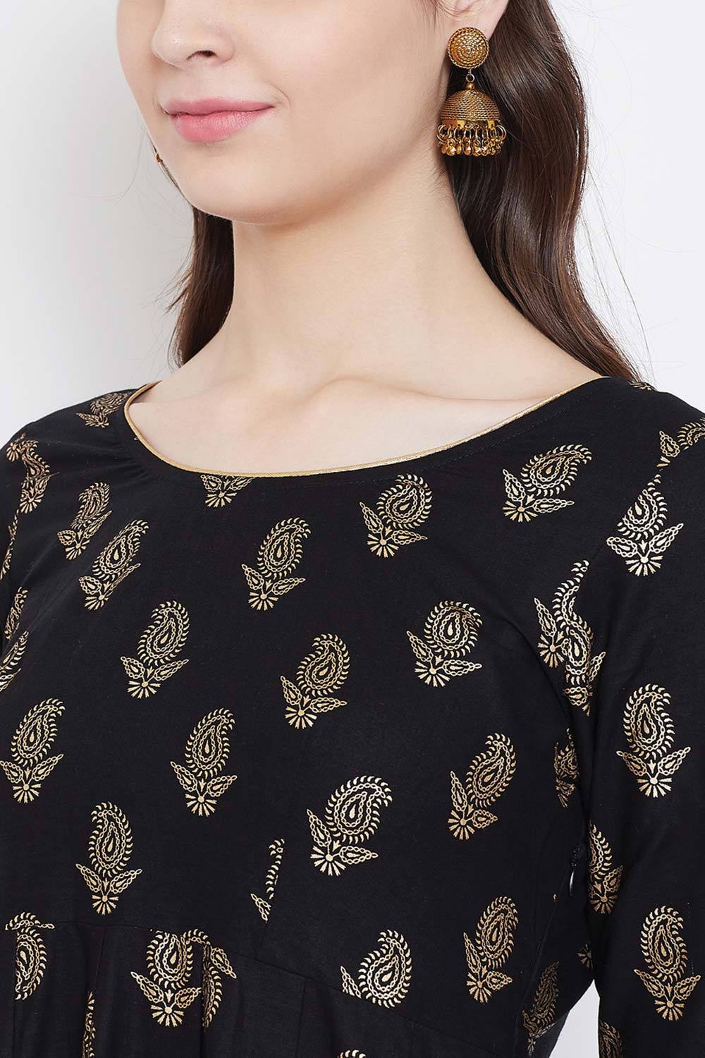 Black Cotton Gold Printed Stylish Anarkali Kurti