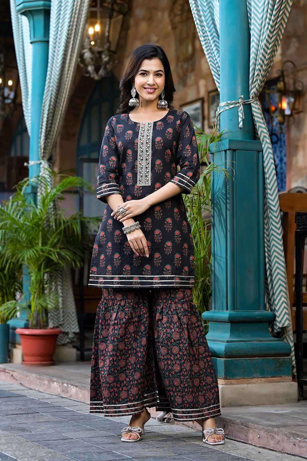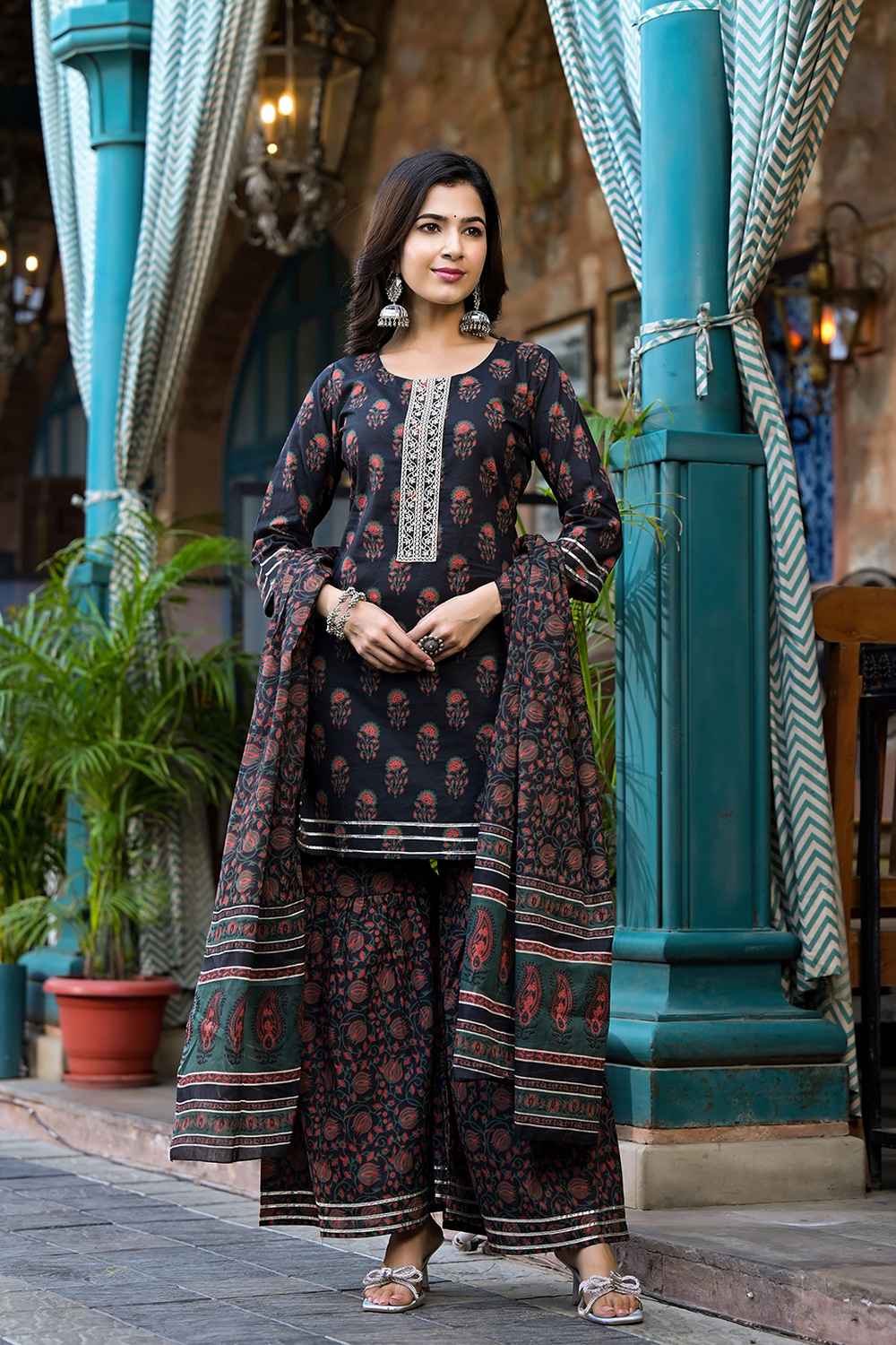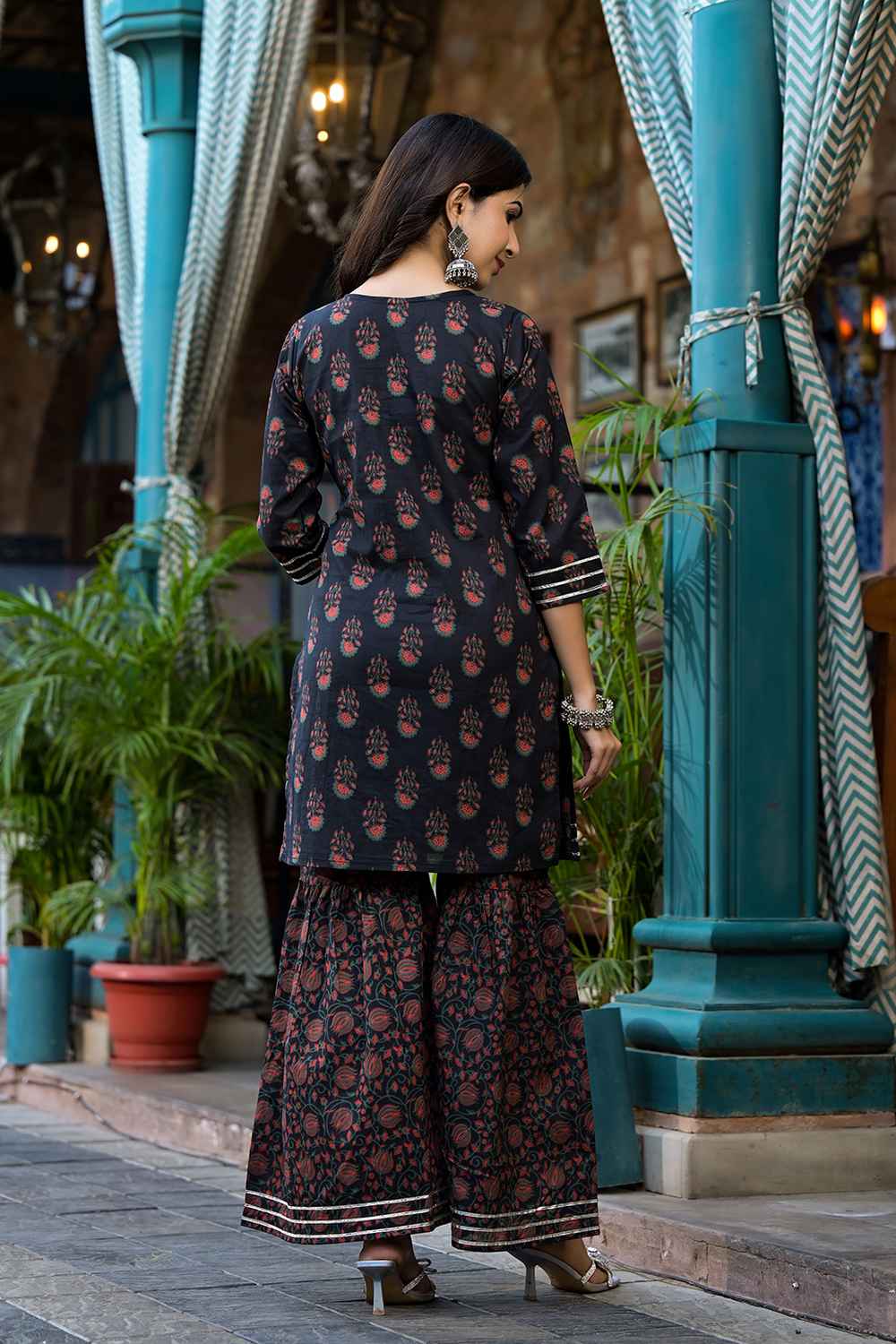 Black Floral Print Zari Work Pure Cotton Kurti Pant Set