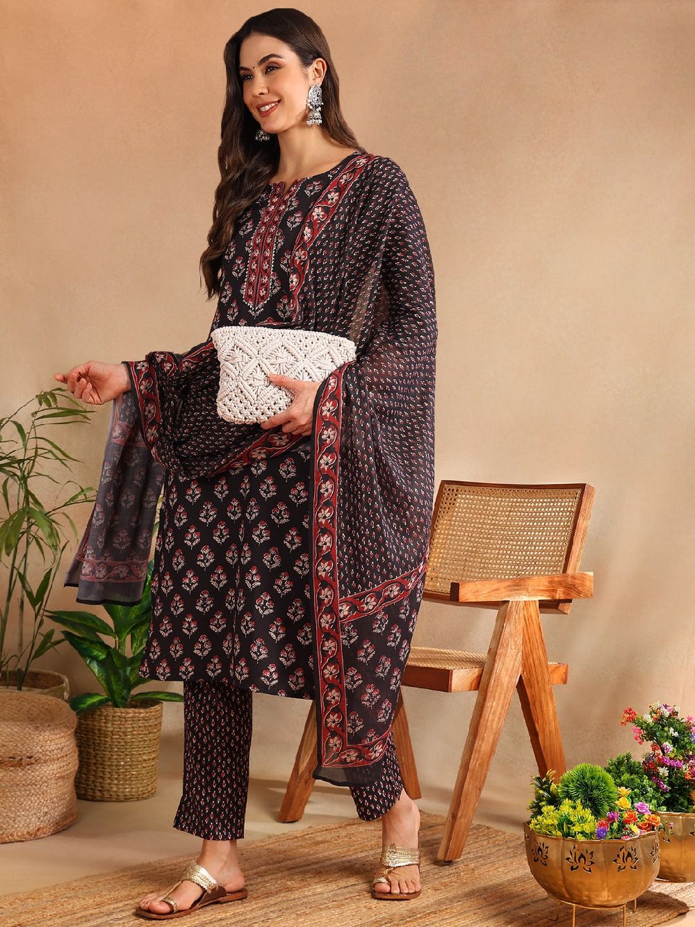 Black Rayon Blend Floral Printed Straight Kurti Pant With Dupatta