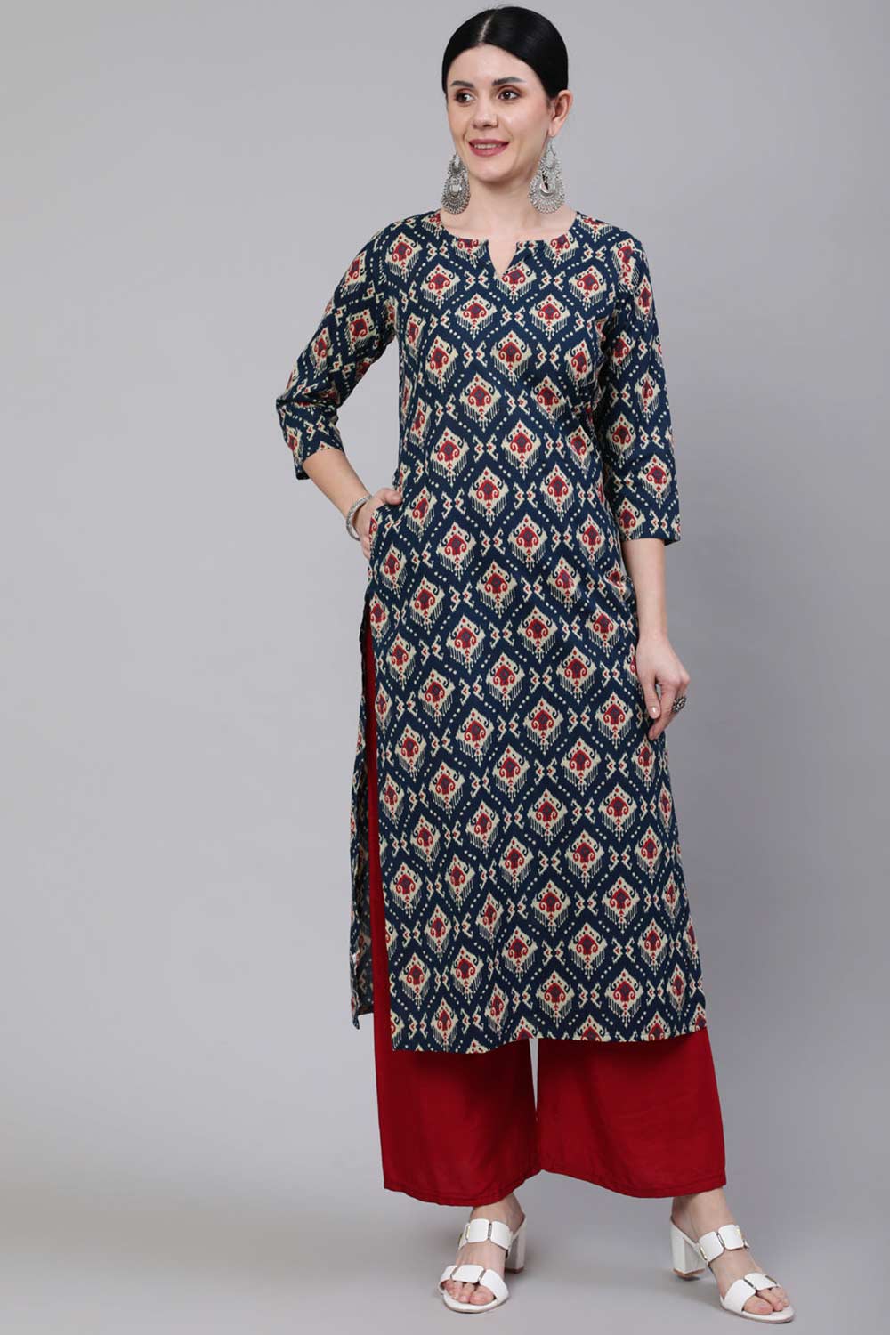Blue Cotton Geometric Ethnic Printed Straight Kurti
