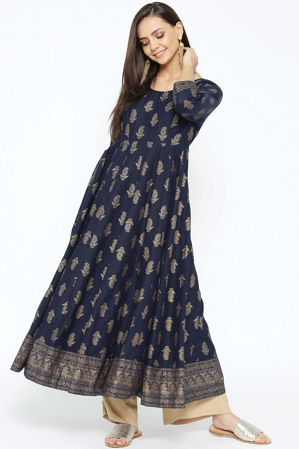Blue Cotton Gold Printed Stylish Anarkali Kurti