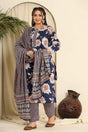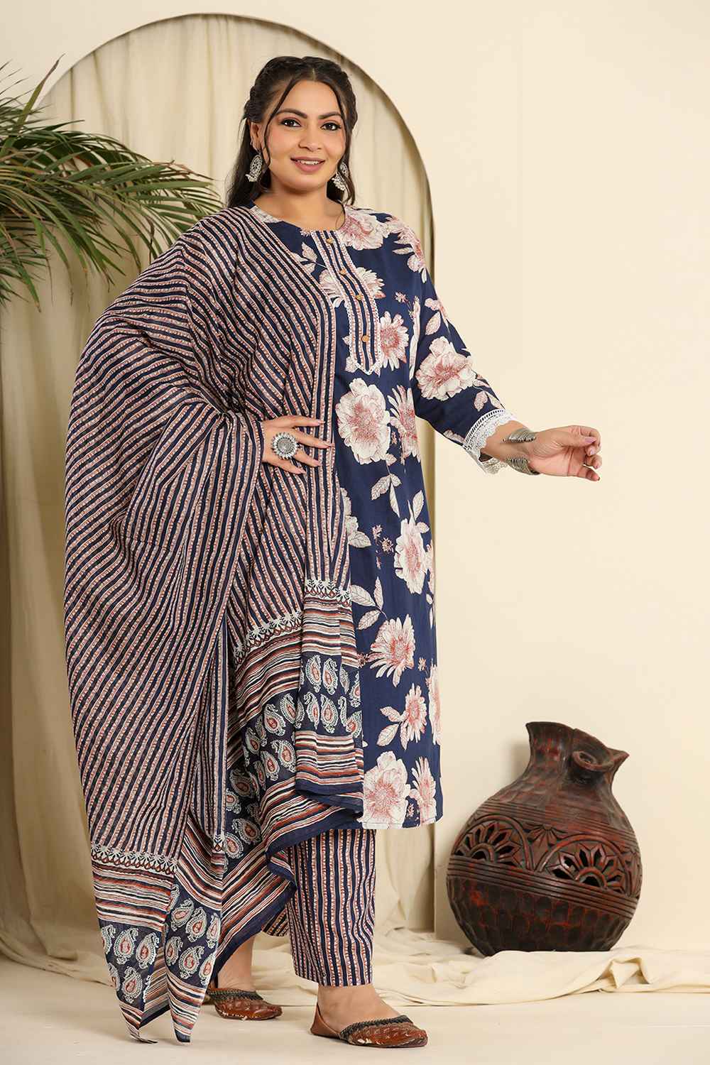 Blue Floral Printed Pure Cotton Kurti Pant Set
