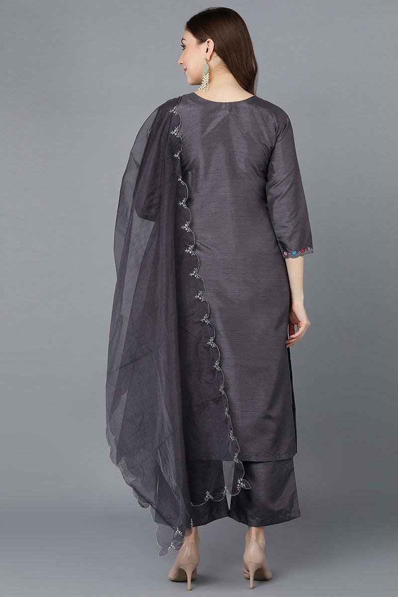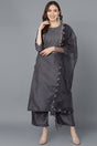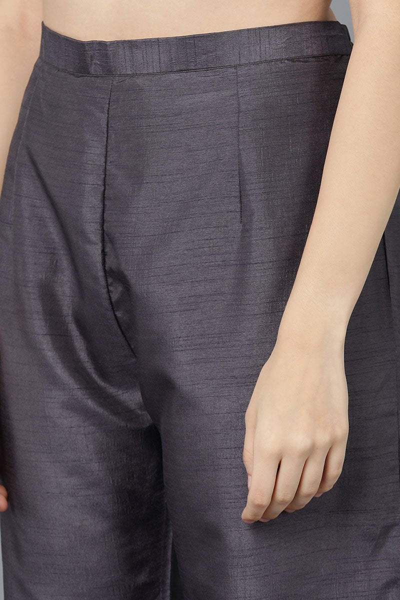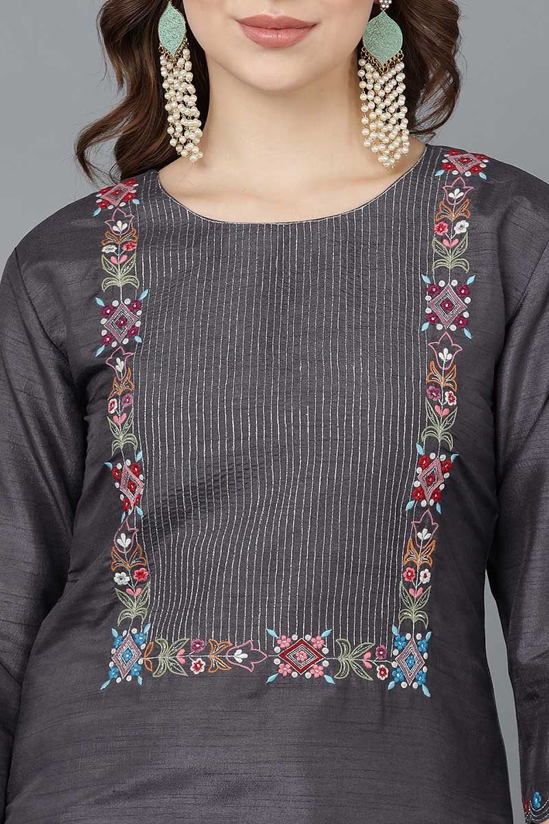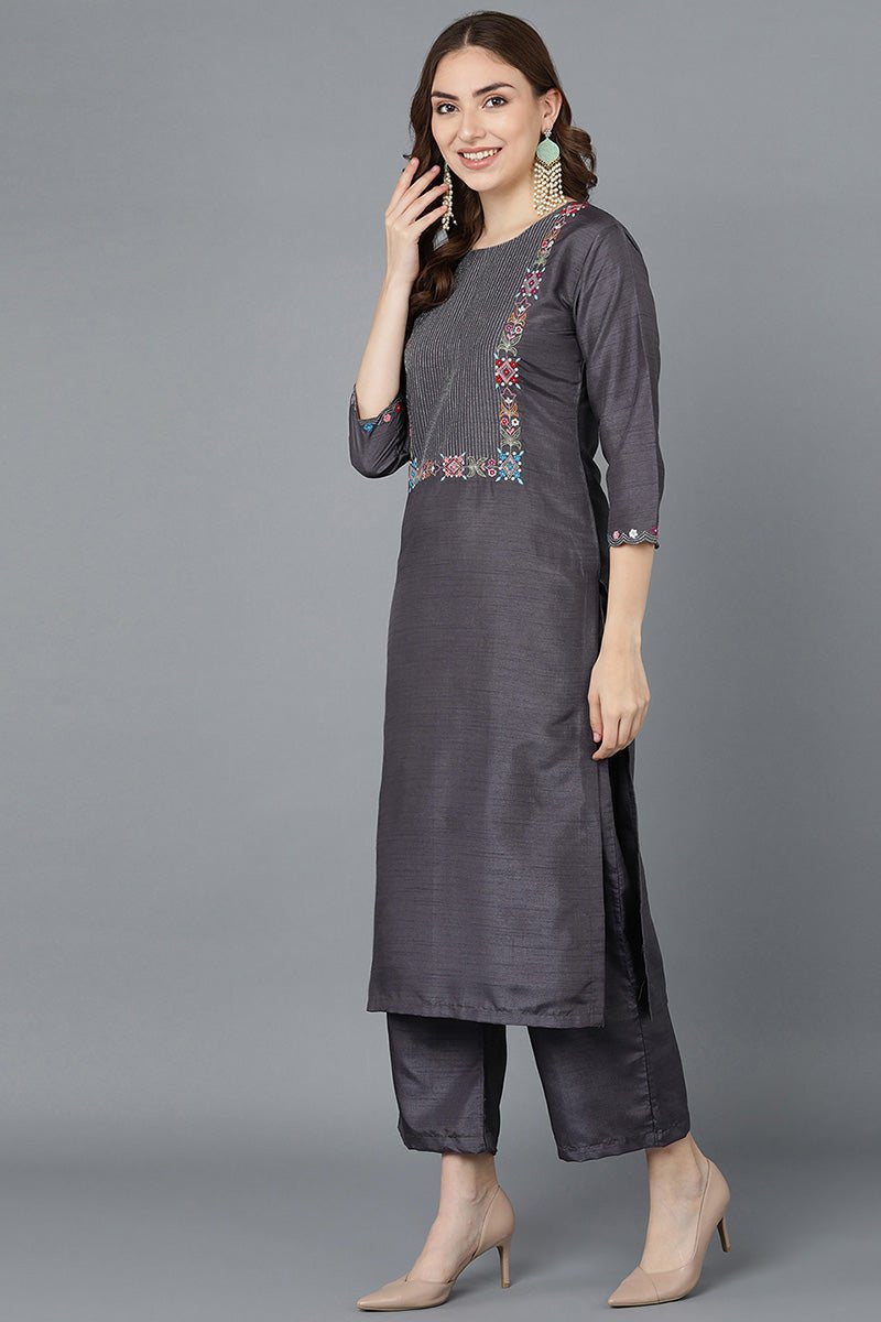 Charcoal Poly Silk Embroidered Kurti Pant Set