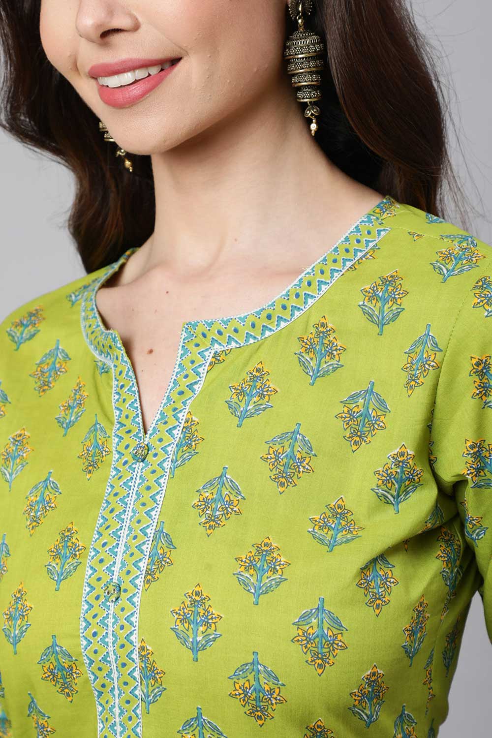 Green Cotton Ethnic Printed Straight Kurti With Trouser