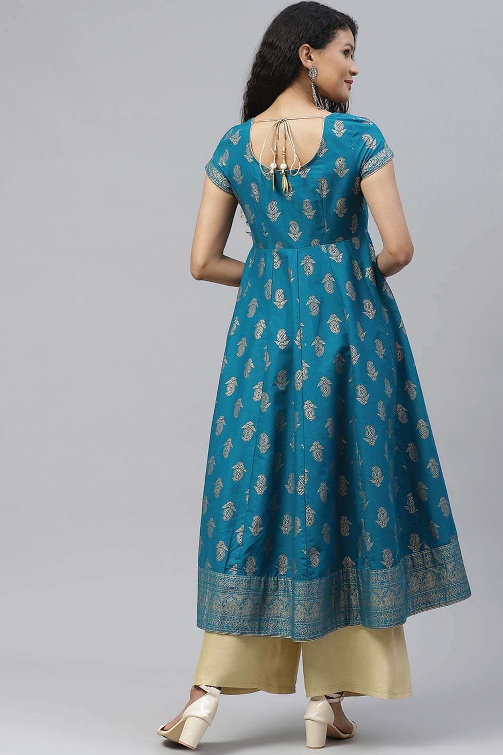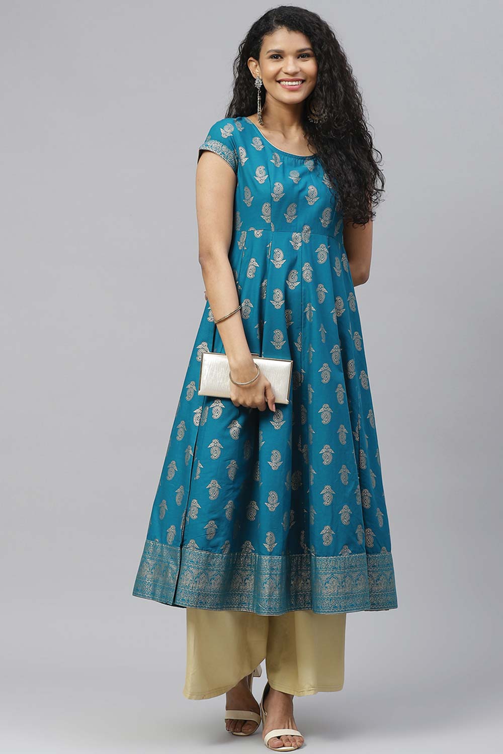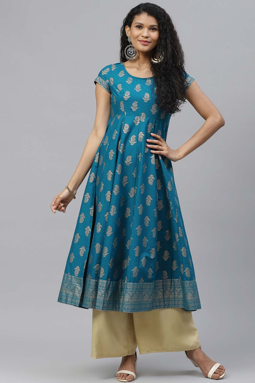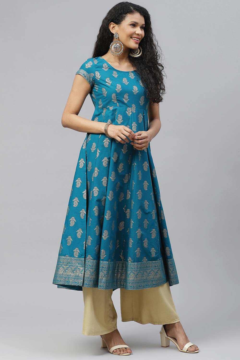 Gold Print Anarkali has Round Neck, Side Zipper, Cap sleeve, Ankle Length with one pair of Golden Beautiful Latkan (Backside).The Fabric is 100% Pure cotton.