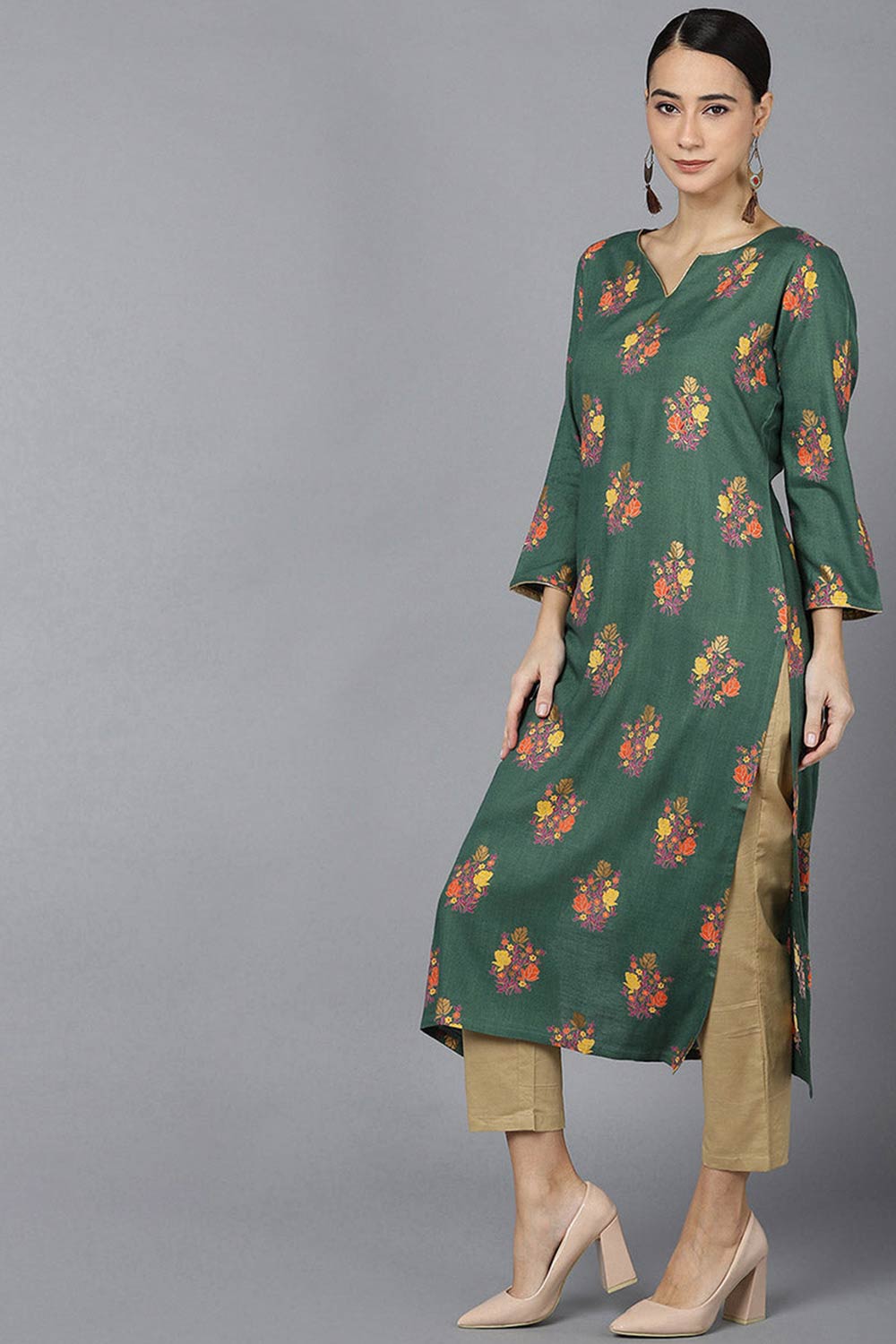 This Green Cotton Round Neck Kurti is a timeless choice for any occasion. The intricate prints add a touch of sophistication to the ensemble, while the comfortable rayon fabric ensures effortless elegance and ease throughout the day.