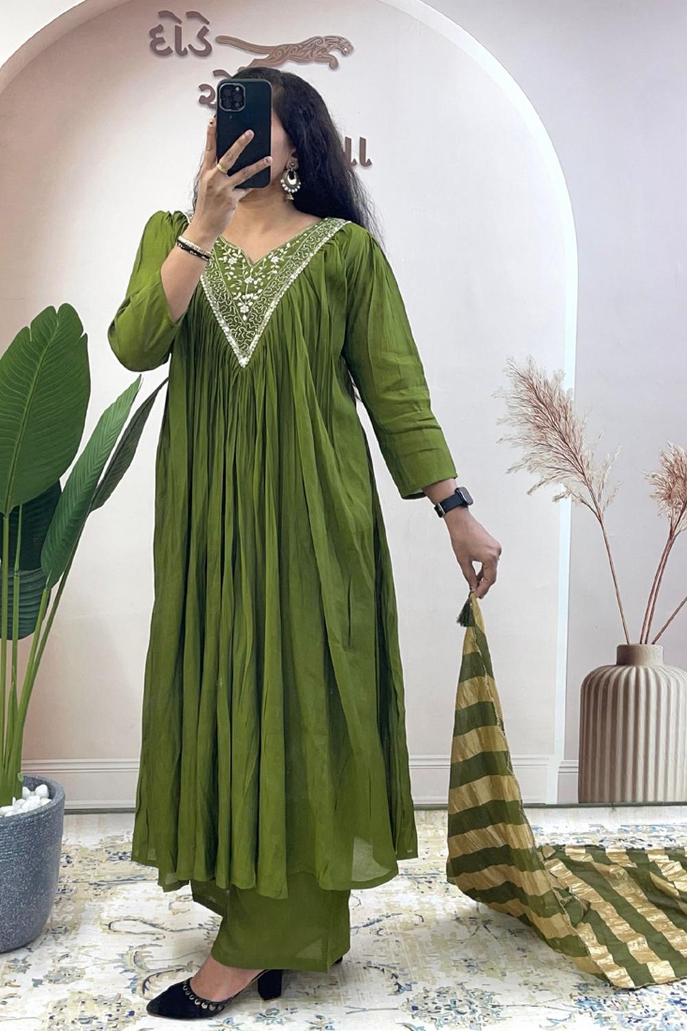 Green Floral Embroidered Cotton Kurti Palazzo Set (WM27-GREEN)