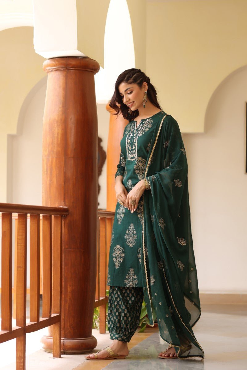 Green Gold Ethnic Print Sequin Detail Cotton Kurta With Trousers Dupatta