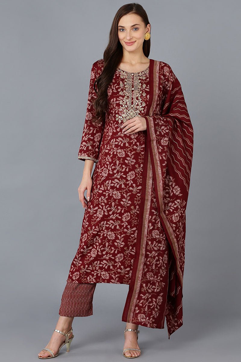 Maroon Silk Blend Floral Straight Kurti Pant Set