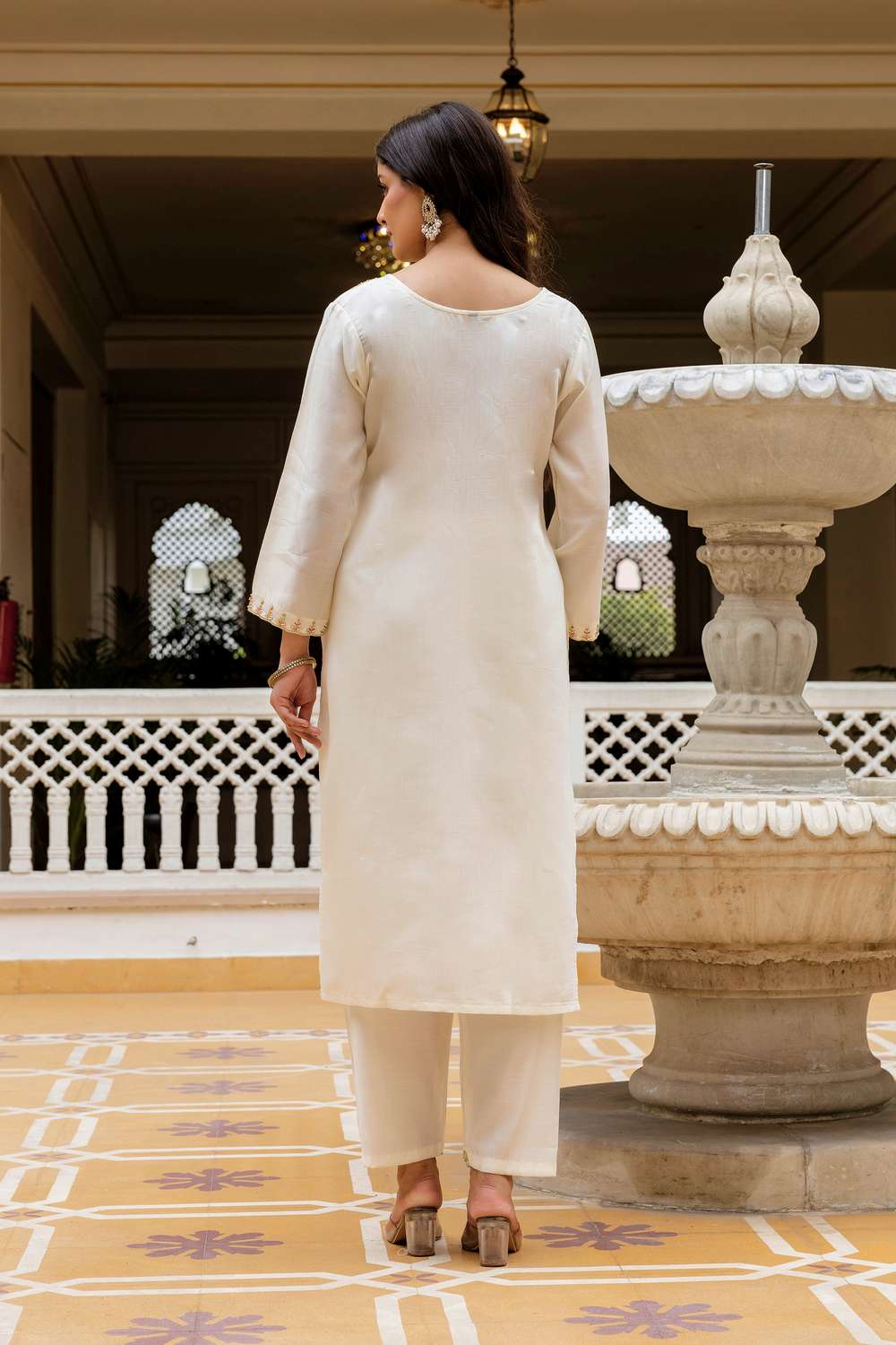 Off White Chanderi Sequin with Embroidered Kurti Pant Set