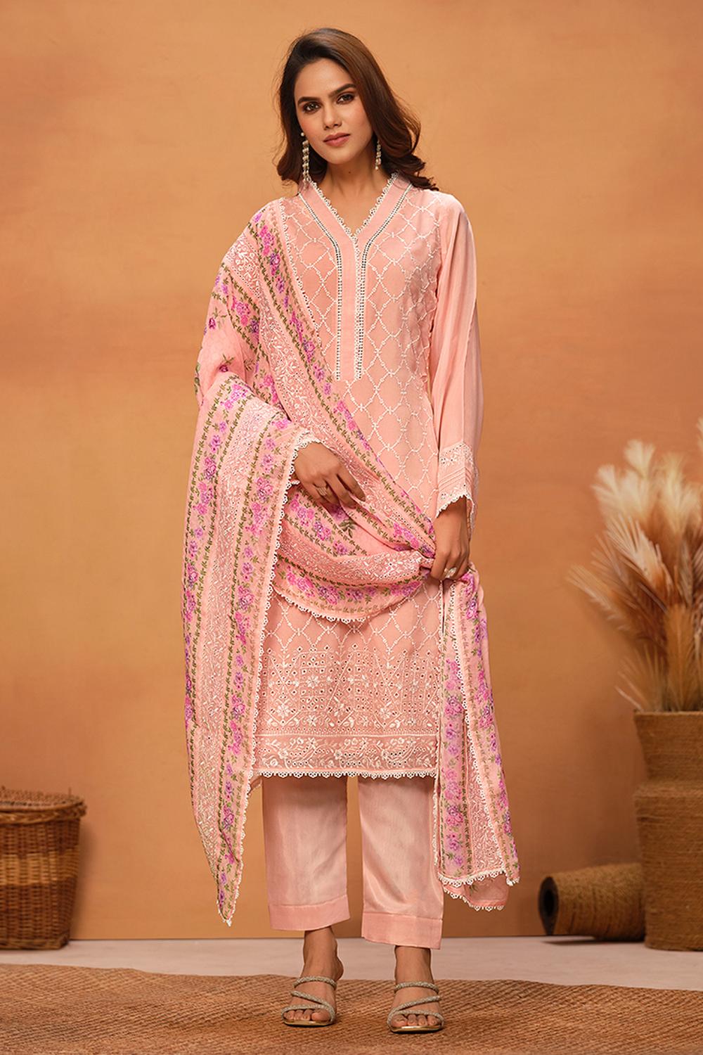 Peach Floral Embroidered Viscose Kurti Pant Set
