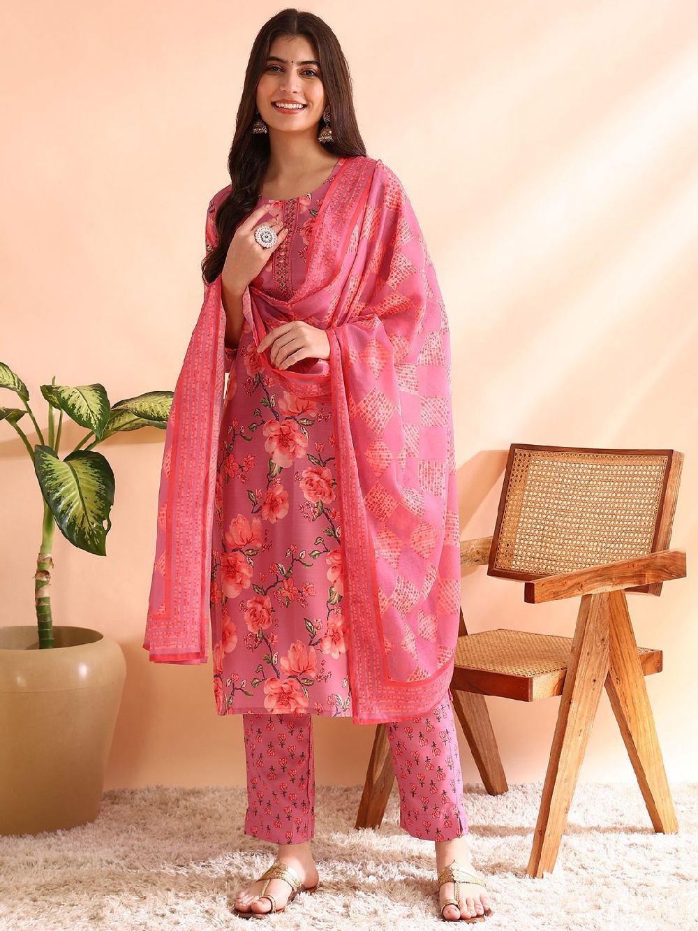 Pink Poly Rayon Floral Printed Straight Kurti Pants With Dupatta