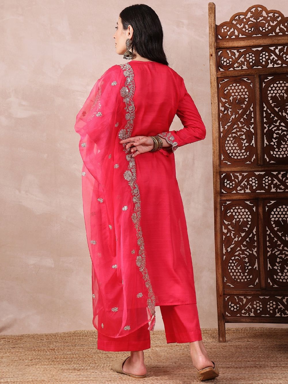 Pink Silk Blend Solid Embroidered Straight Kurti Palazzo With Dupatta