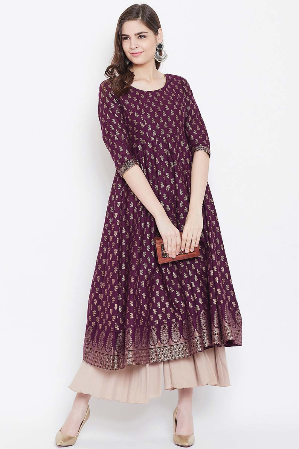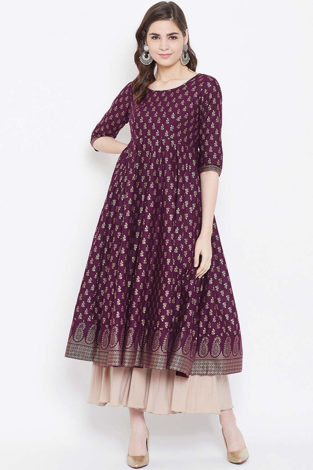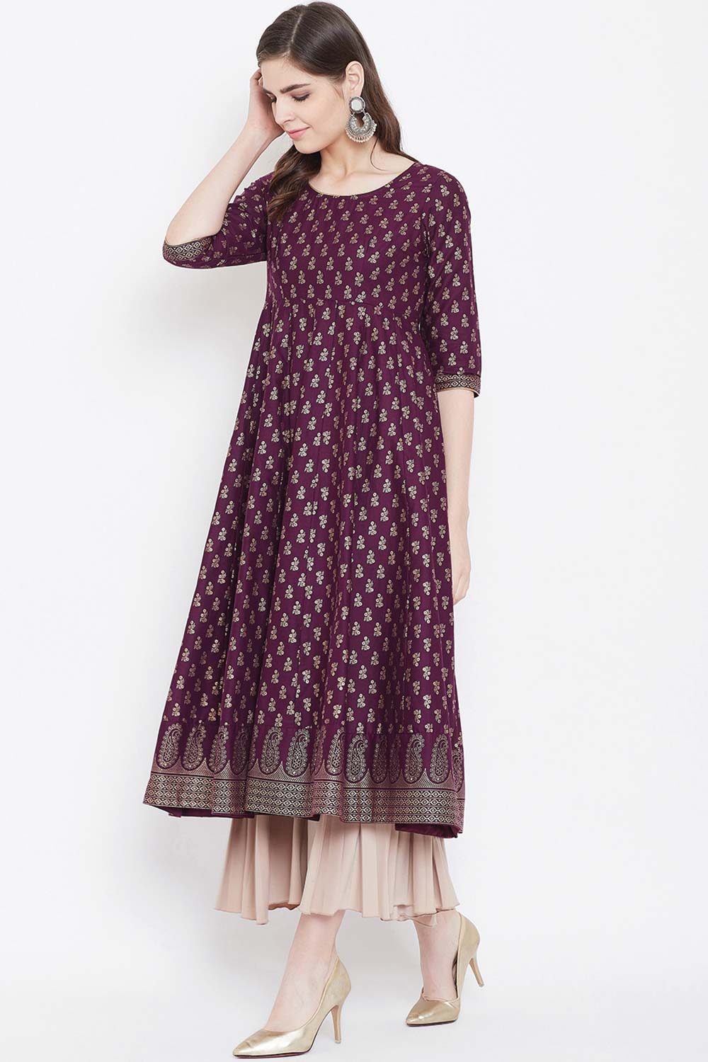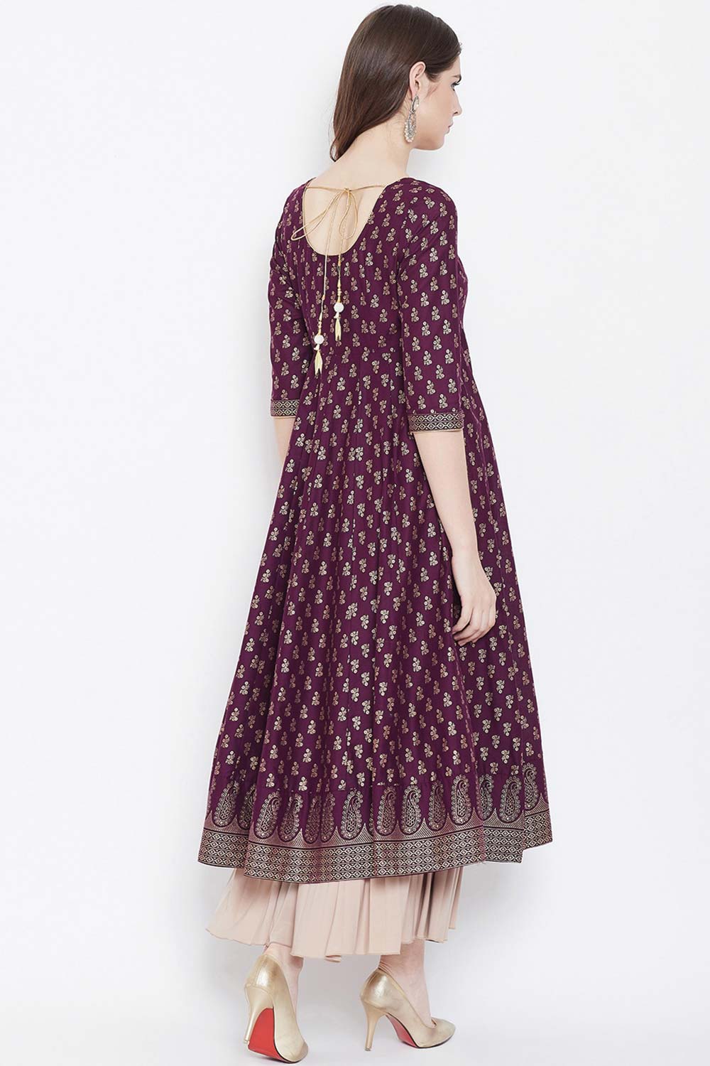 Purple Cotton Gold Printed Stylish Anarkali Kurti