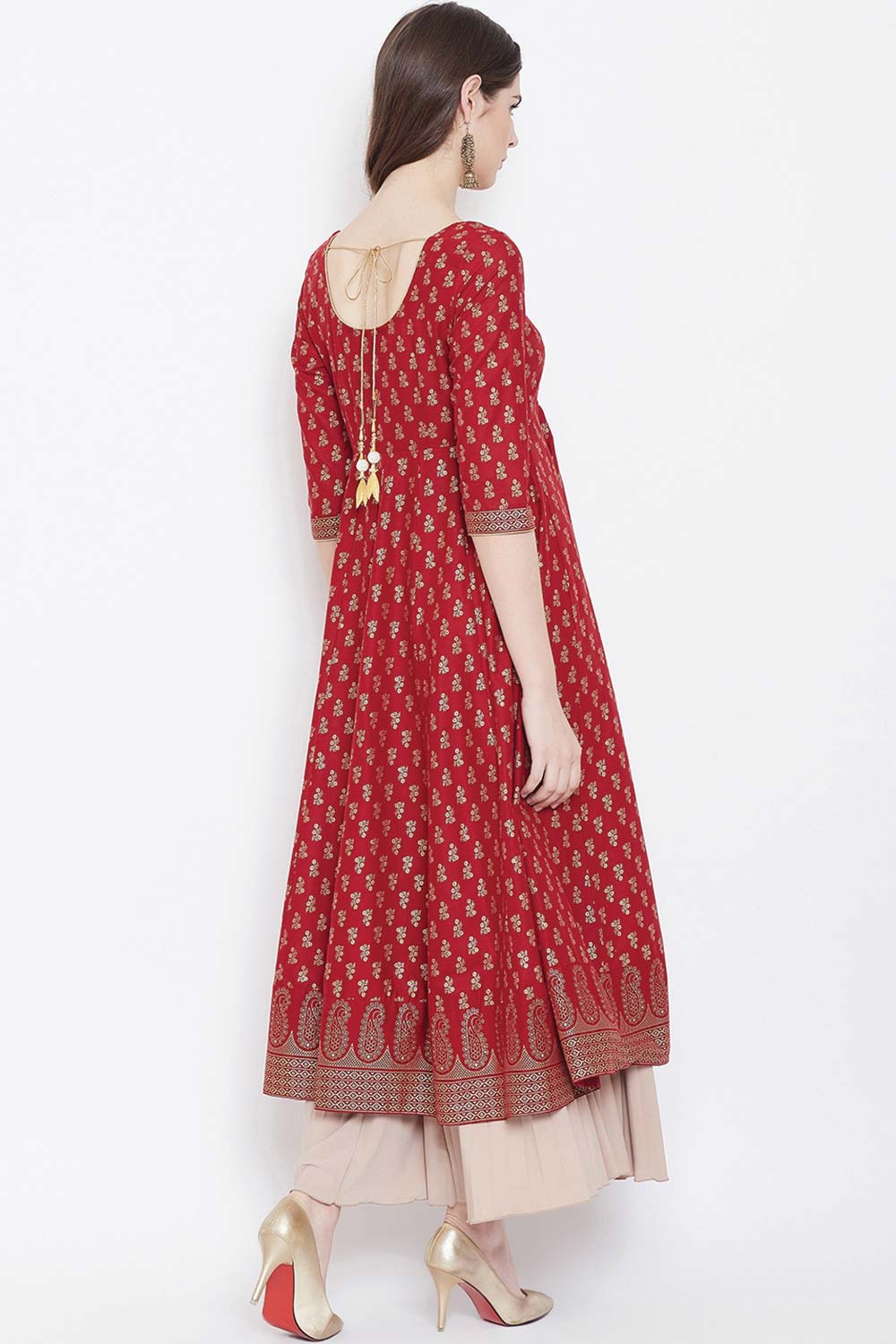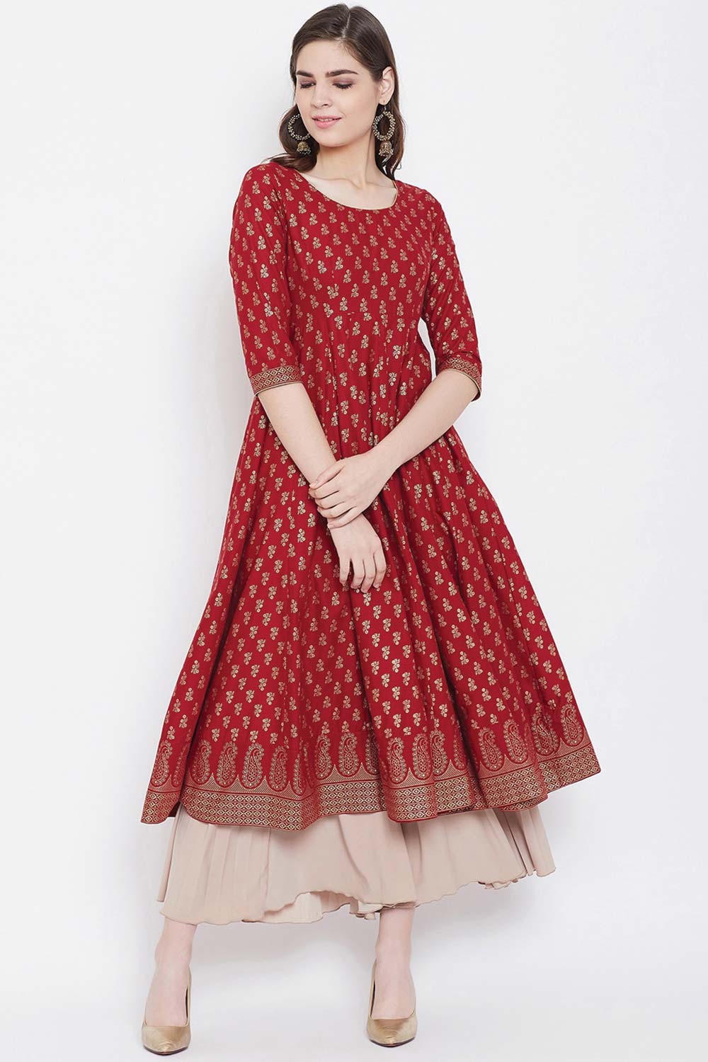 Gold Print Anarkali has Round Neck, Side Zipper, 3/4 th sleeve, Ankle Length with one pair of Golden Beautiful Latkan (Backside). The Fabric is 100% Pure cotton.