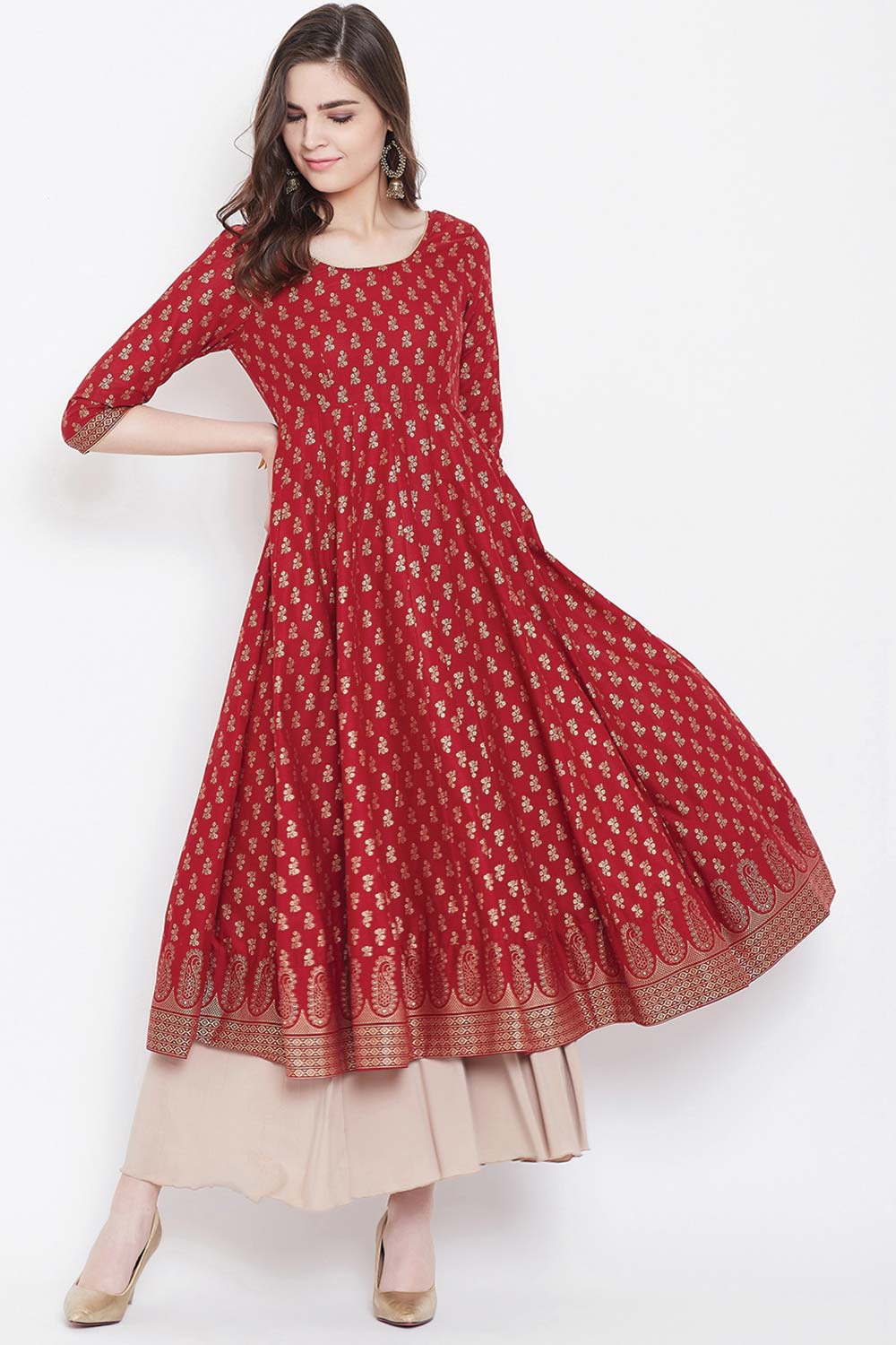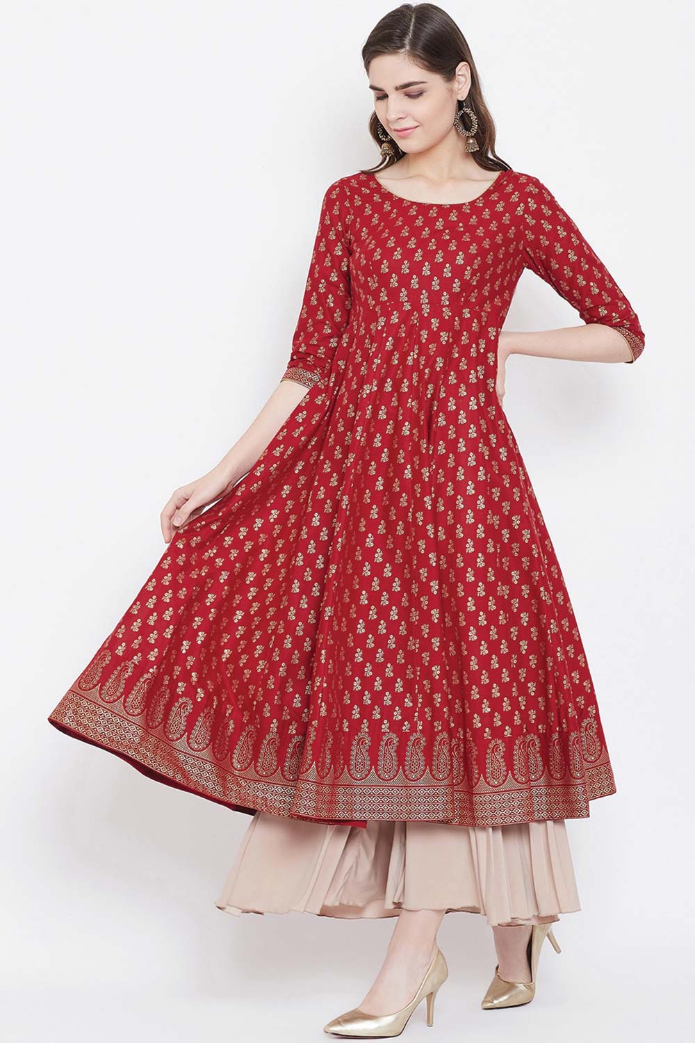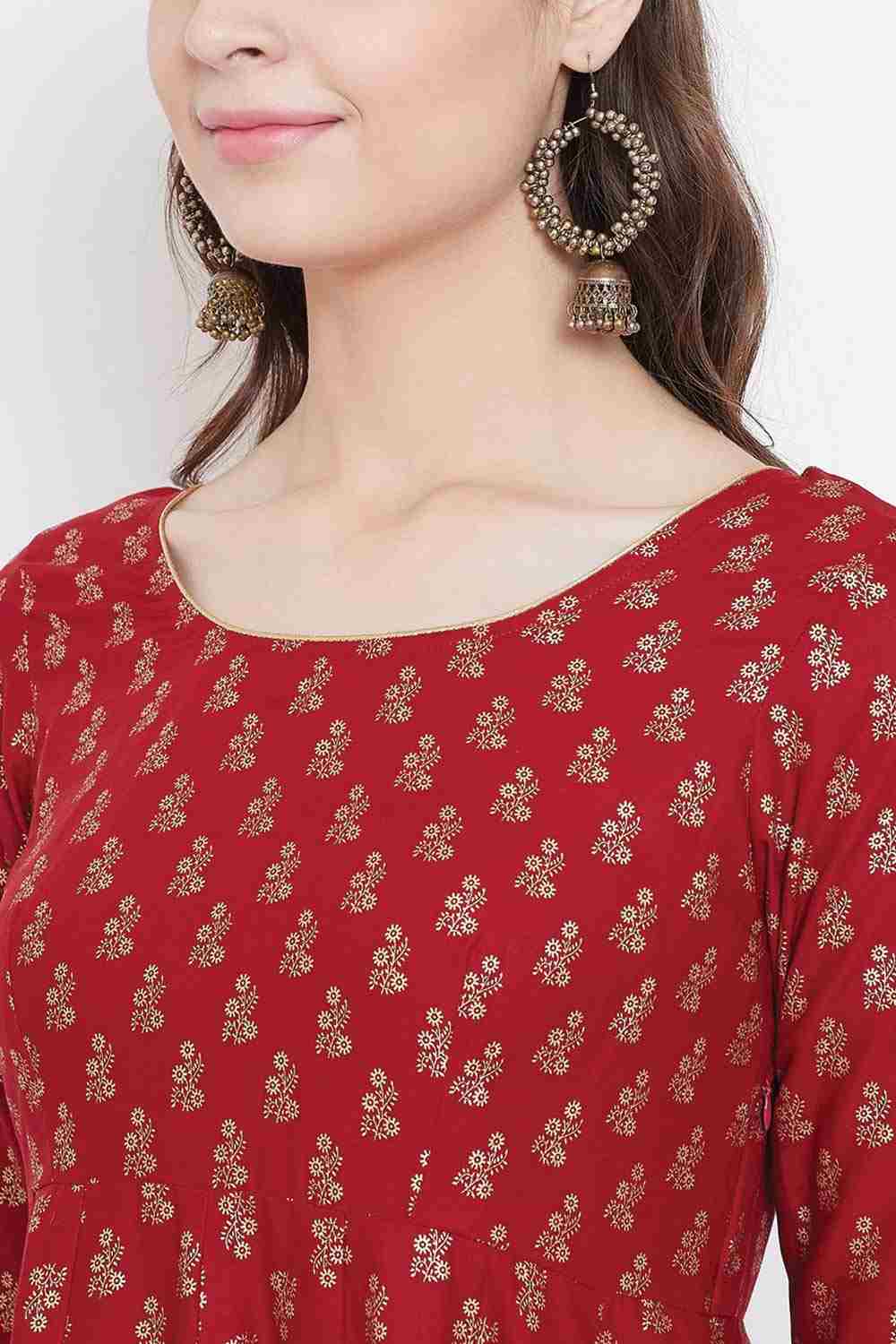 Red Cotton Gold Printed Stylish Anarkali Kurti