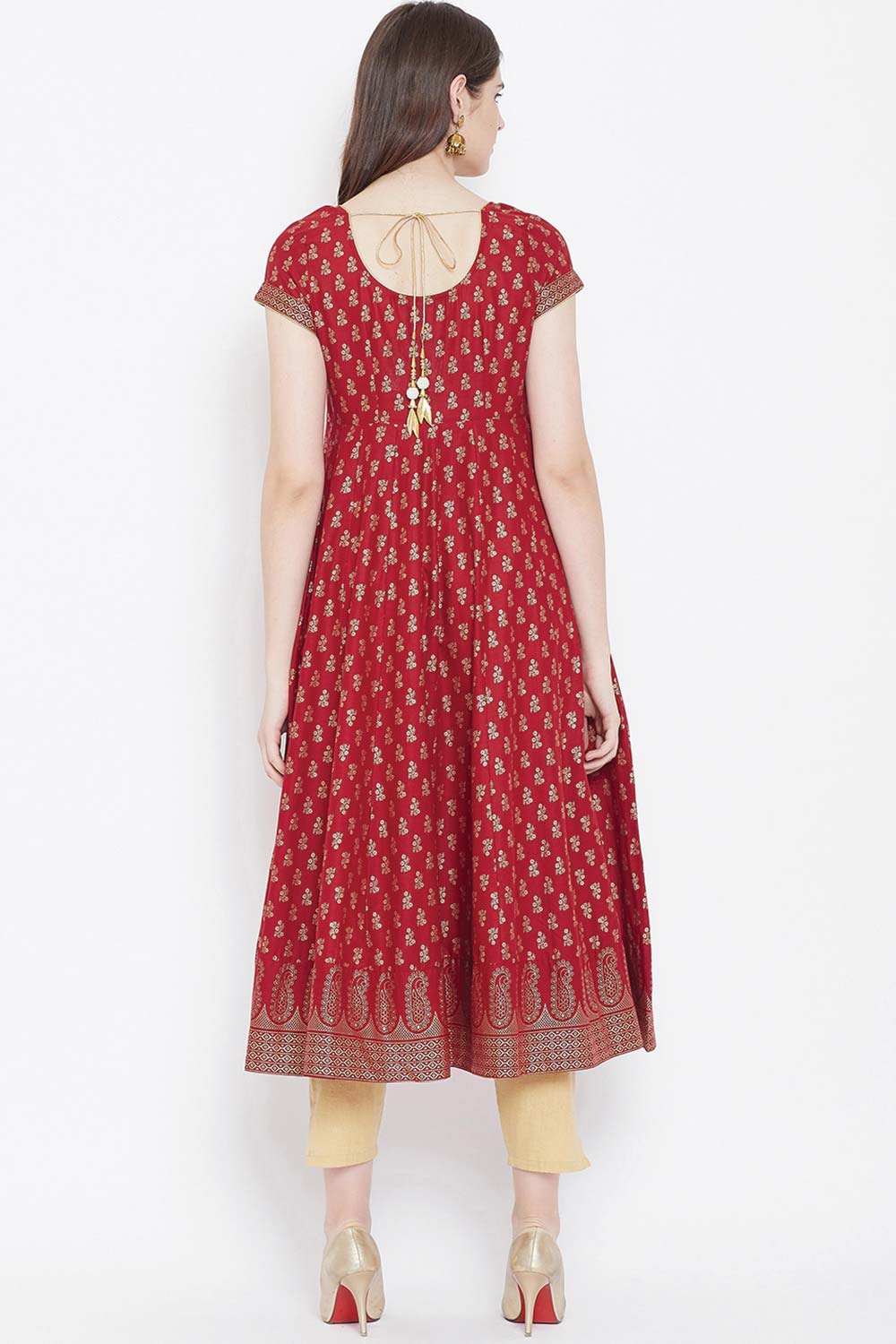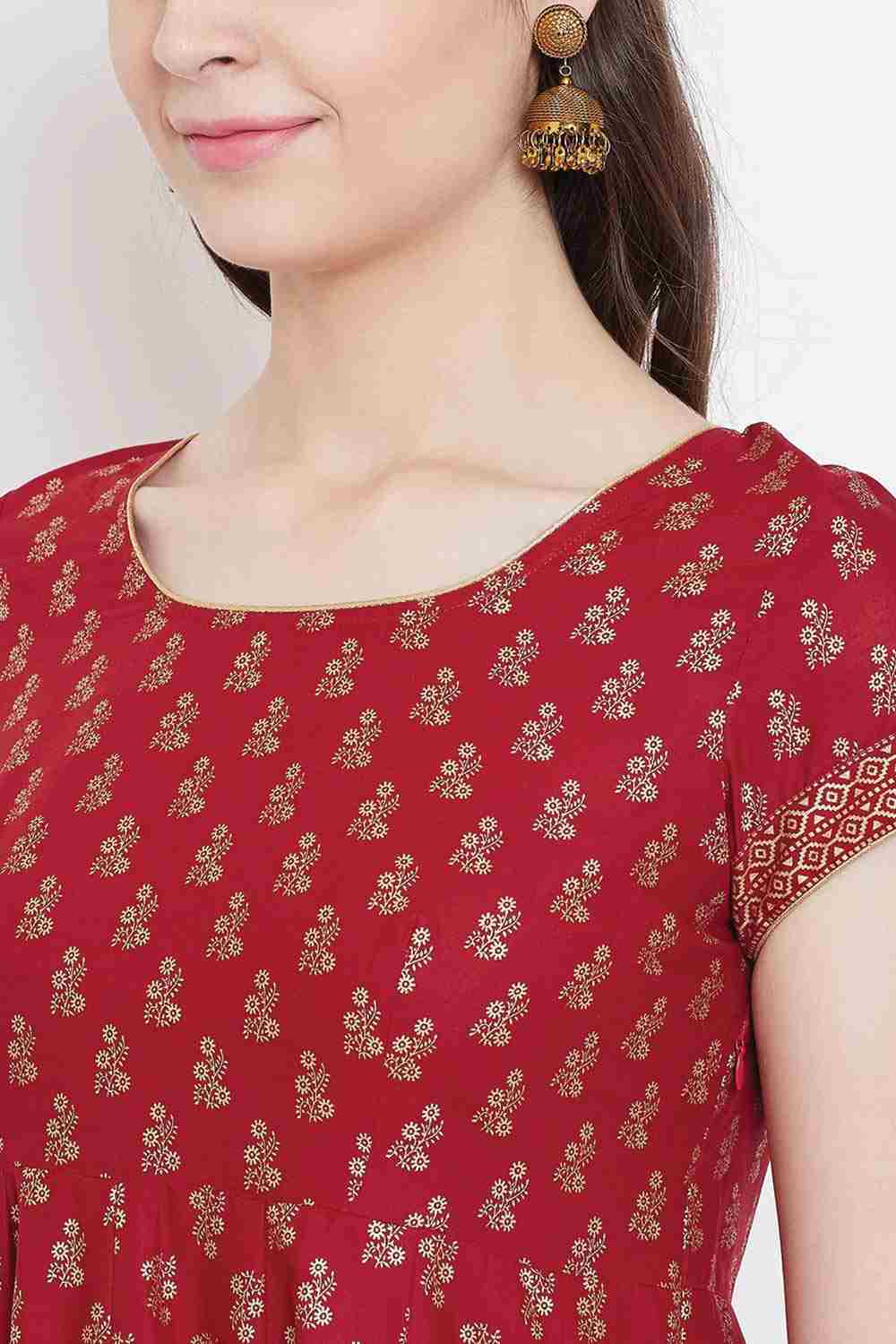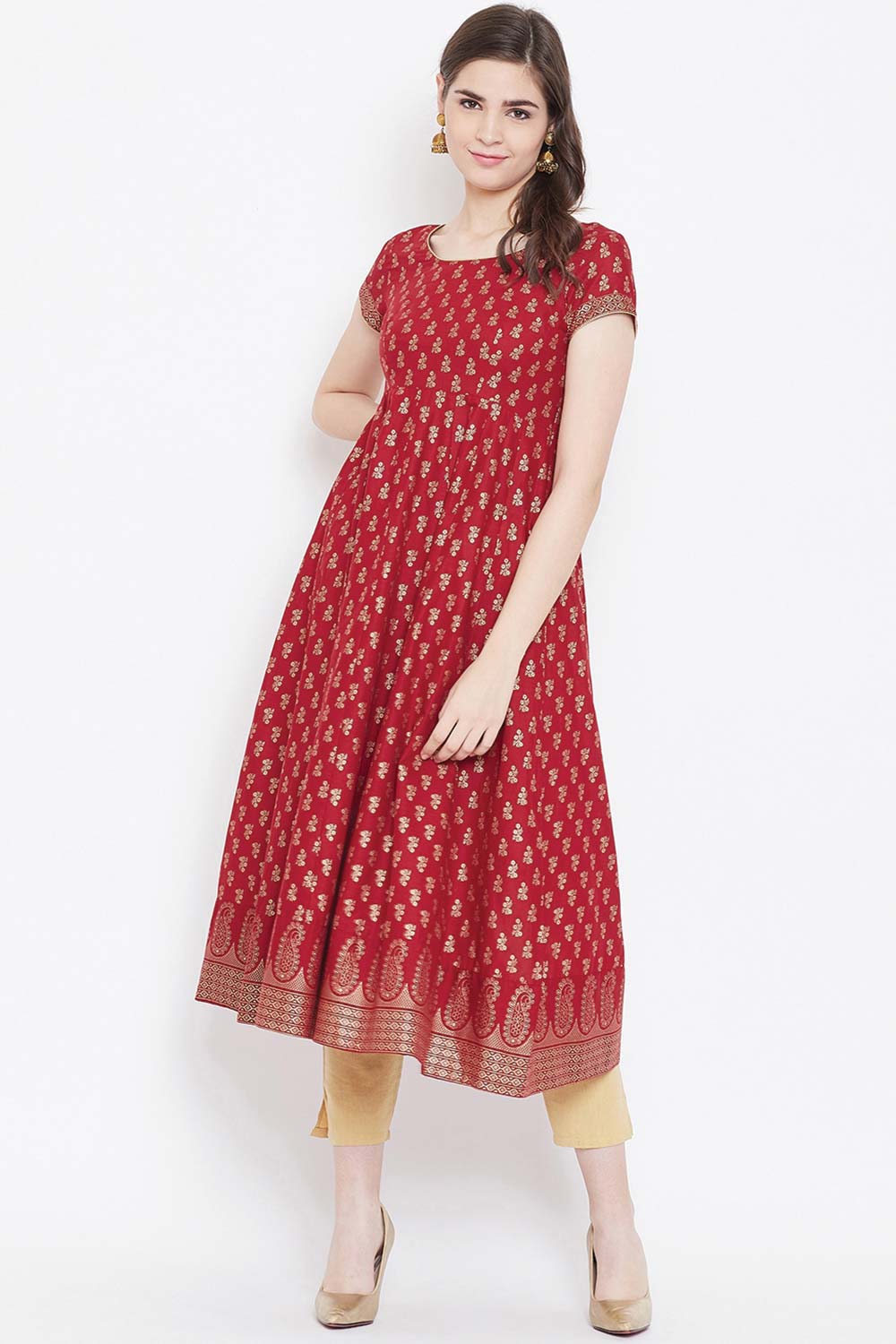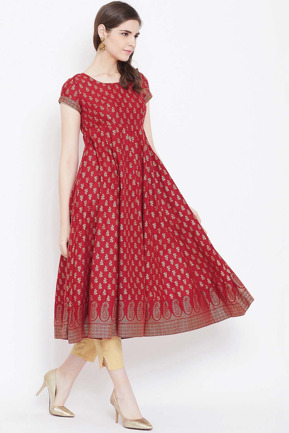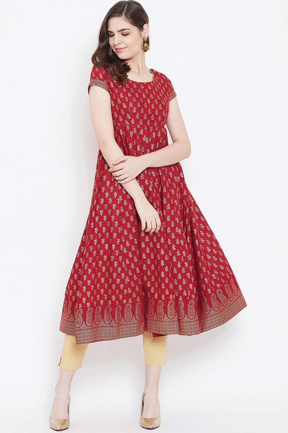 Red Cotton Gold Printed Stylish Anarkali Kurti