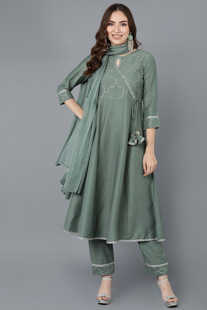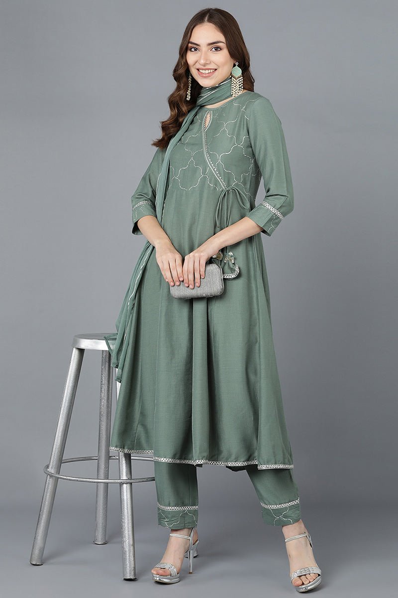 Teal Poly Silk Embroidered Kurti Trousers With Dupatta