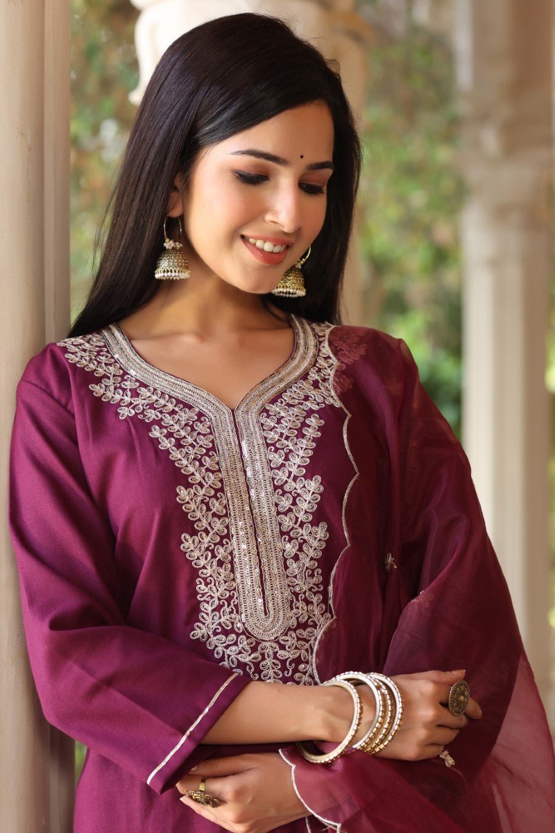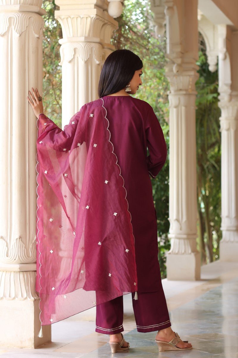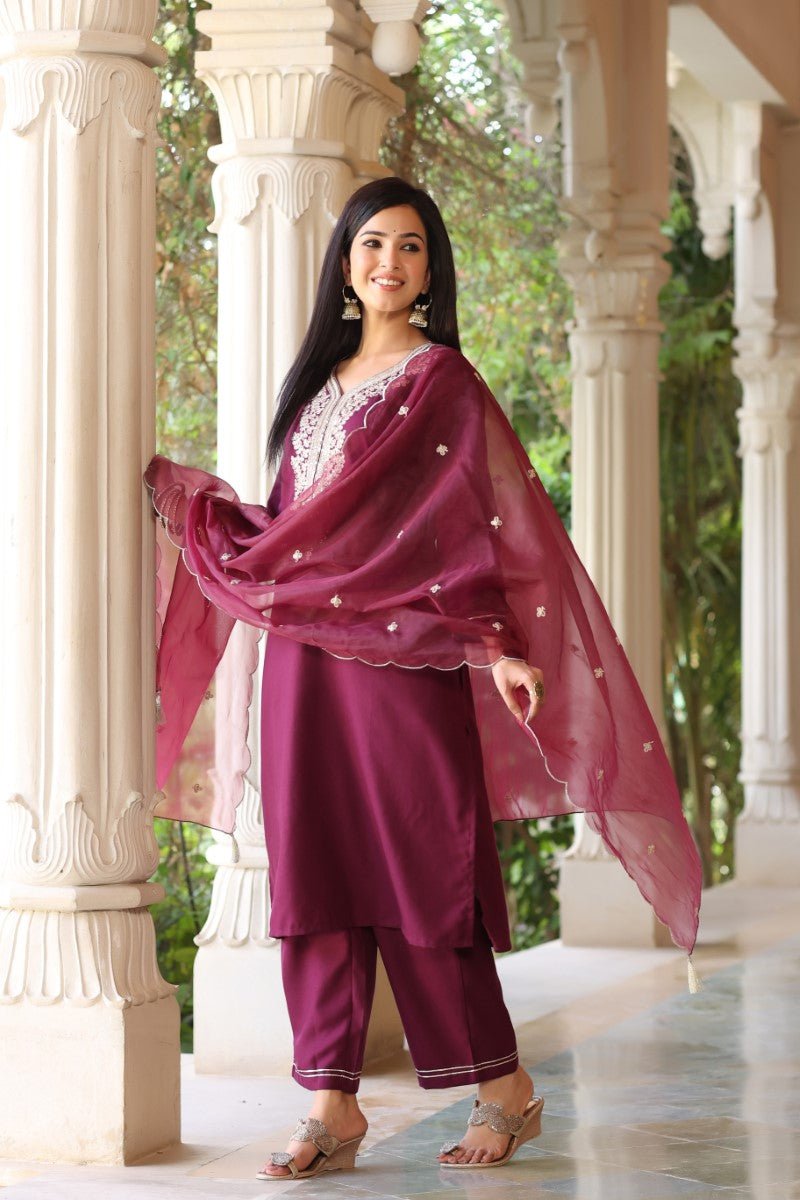 Wine Poly Silk Solid Embroidered Straight Suit Set