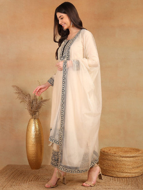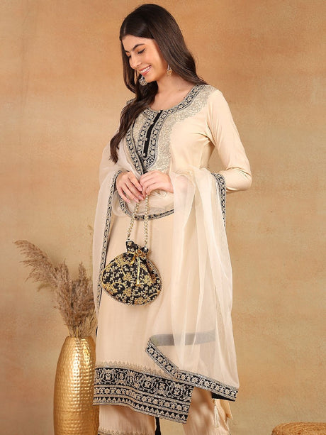 Cream Silk Blend Solid Embroidered Straight Kurti Pant With Dupatta
