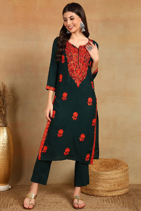 Green Georgette Embroidered Thread Work Flared Kurti Set