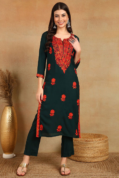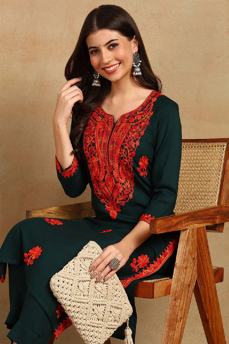 Green Embroidered Viscose Rayon Straight Cut Kurti