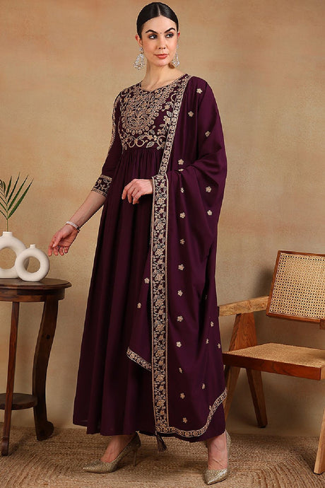 Blue Silk Blend Solid Embroidered Anarkali Kurti Palazzo With Dupatta