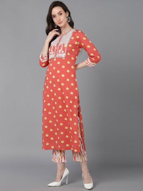 Orange Rayon Blend Bandhani Embroidered Straight Kurti Pants With Dupatta