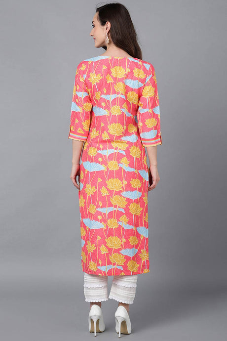Yellow Cotton Floral Print Mandarin Collar Kurti