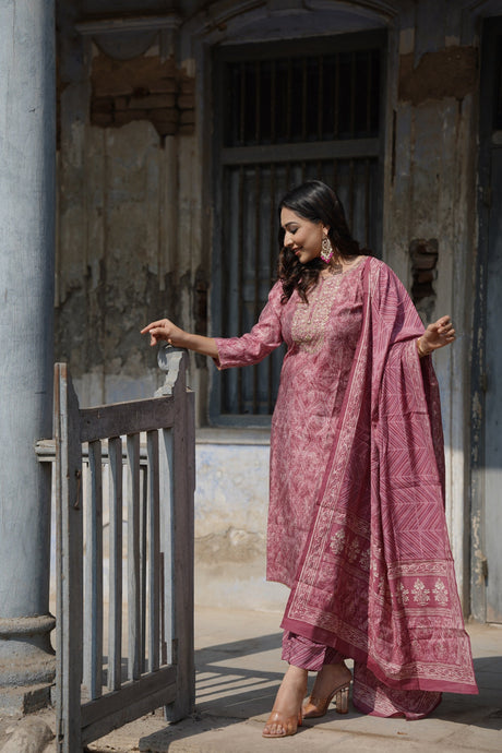 Pink Silk Blend Bandhani Print Embroidered Straight Suit Set