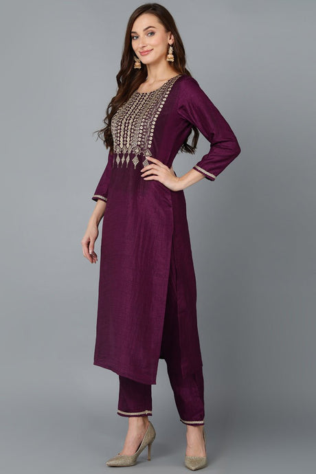 Purple Silk Blend Yoke Design Kurti Pant With Dupatta