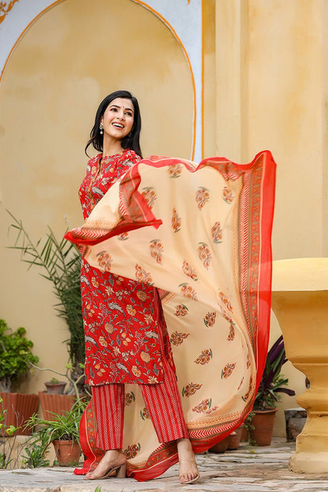 Red Color Cotton Fabric Printed Fancy Kurti And Palazzo Dupatta Set