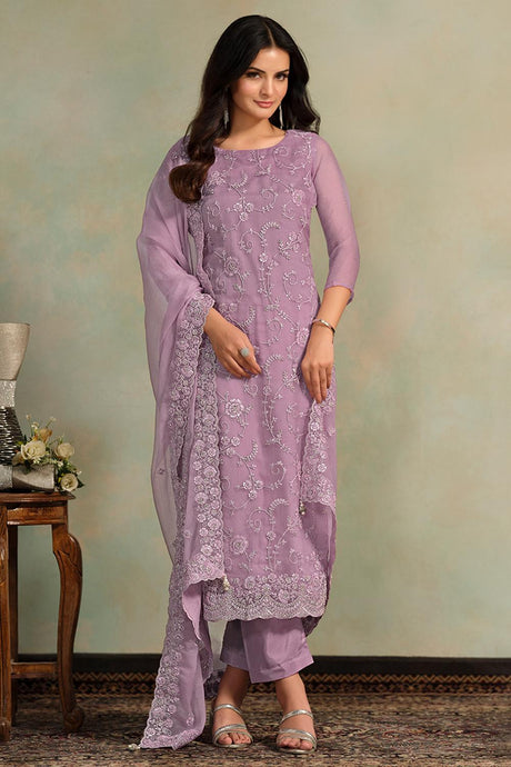 Lavender Floral Embroidered Organza Kurti Pant Set