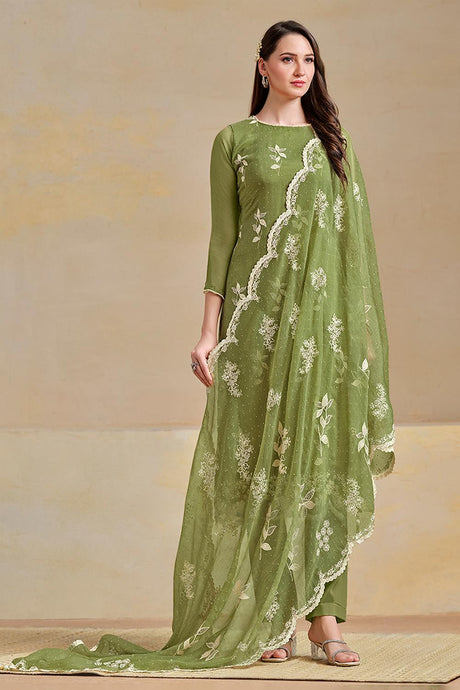 Green Floral Embroidered Organza Kurti Pant Set