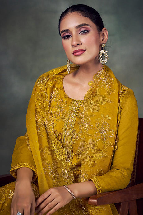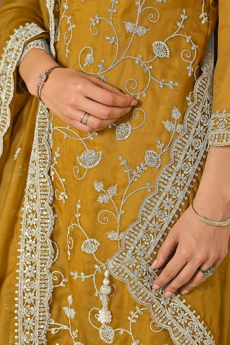 Mustard Floral Embroidered Organza Kurti Pant Set