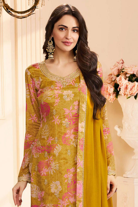 Mustard Floral Embroidered Organza Kurti Palazzo Set