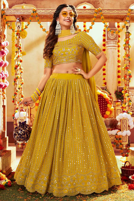 Mustard Faux Georgette Sequin Embroidery Work Lehenga Choli