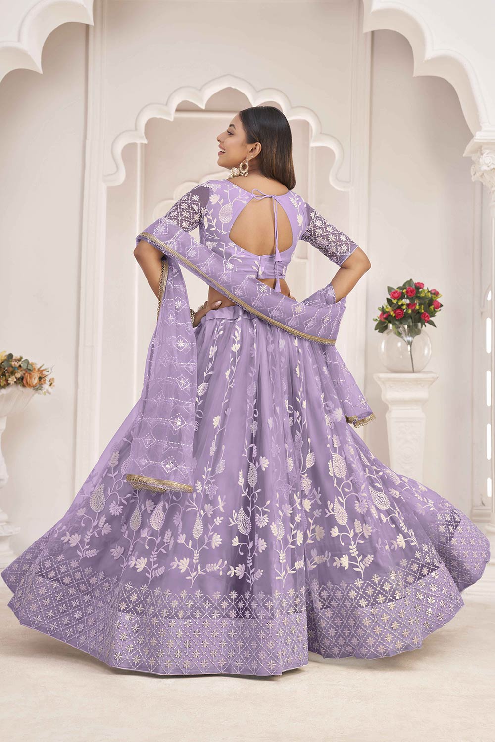Lavender Butterfly Net Cotton Thread Sequin Embroidery Lehenga Set