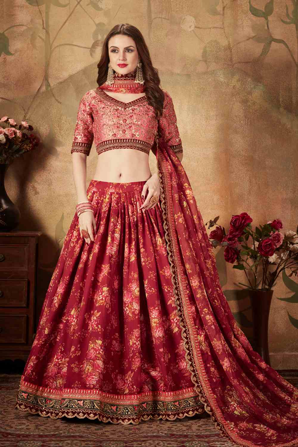 You will definitely earn lots of compliments wearing this organza based designer lehenga choli in pink colored blouse paired with contrasting maroon colored lehenga and dupatta. Its blouse is silk based beautified with embroidery paired with organza fabricated lehenga and dupatta beautified with prints.