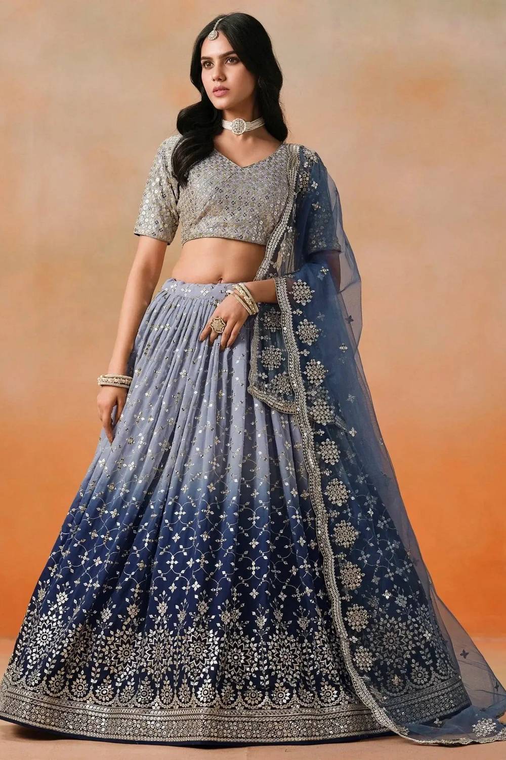 Step into the spotlight with our Lehenga a dazzling creation designed to make your special moments unforgettable. Crafted from premium Georgette this lehenga offers a perfect combination of elegance and ease, keeping you graceful all day long. The exquisite Sequin makes this lehenga a masterpiece of traditional craftsmanship. Whether it’s Sangeet,Mehendi,Reception or a grand celebration, this lehenga is the perfect choice to make a statement. Pair it with an ornate choker, a matching dupatta, and embellished stilettos to complete the regal look. Add a sleek bun or cascading curls for added glamour. Make every moment magical with the timeless allure of Lehenga