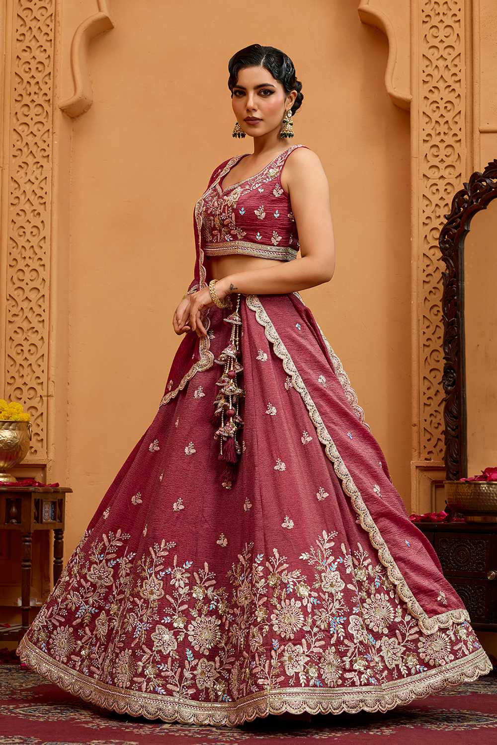 Step into the spotlight with our Lehenga a dazzling creation designed to make your special moments unforgettable. Crafted from premium Tissue this lehenga offers a perfect combination of elegance and ease, keeping you graceful all day long. The exquisite Floral Embroidered makes this lehenga a masterpiece of traditional craftsmanship. Whether it’s Sangeet,Mehendi,Festive,Party or a grand celebration, this lehenga is the perfect choice to make a statement. Pair it with an ornate choker, a matching dupatta, and embellished stilettos to complete the regal look. Add a sleek bun or cascading curls for added glamour. Make every moment magical with the timeless allure of Lehenga