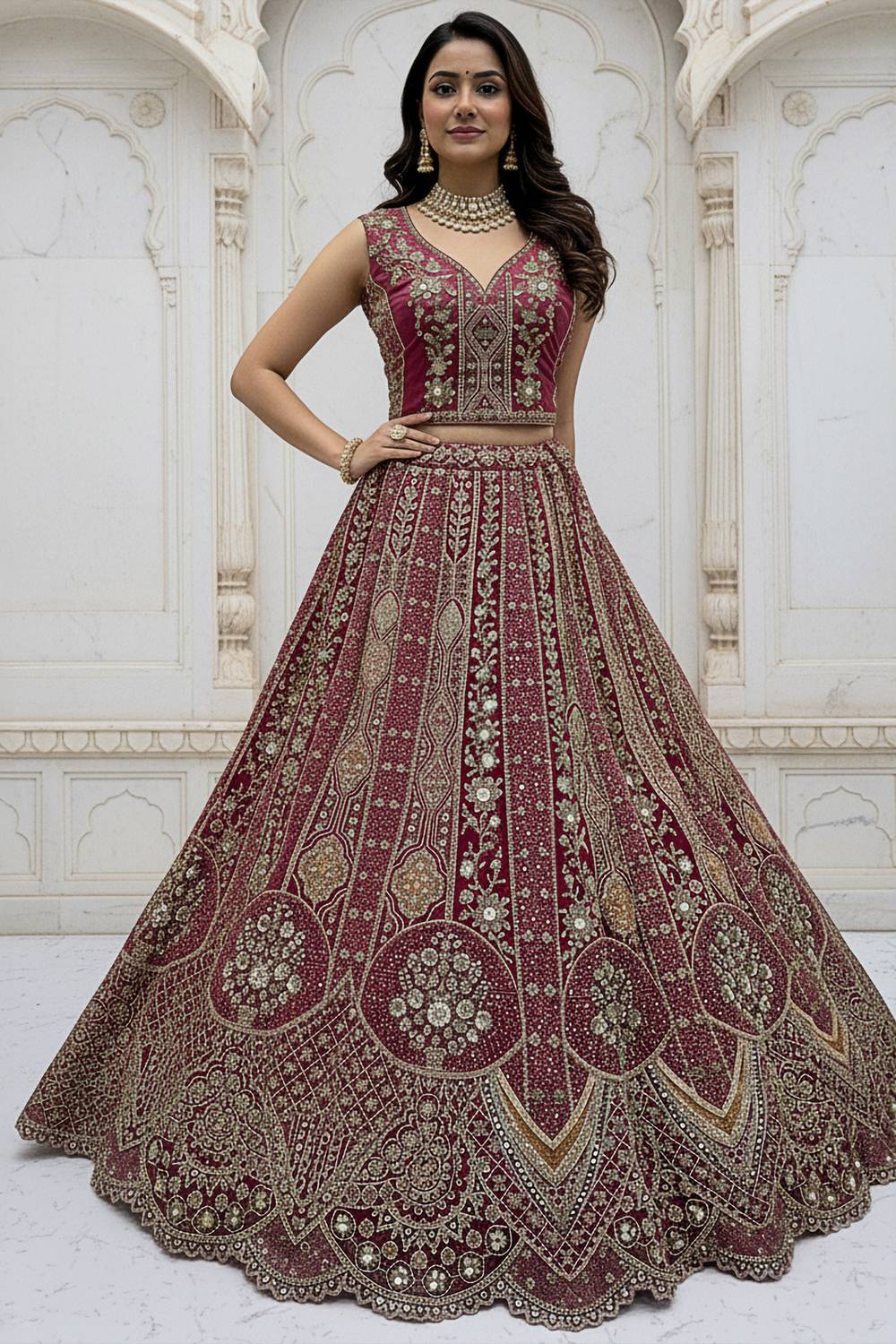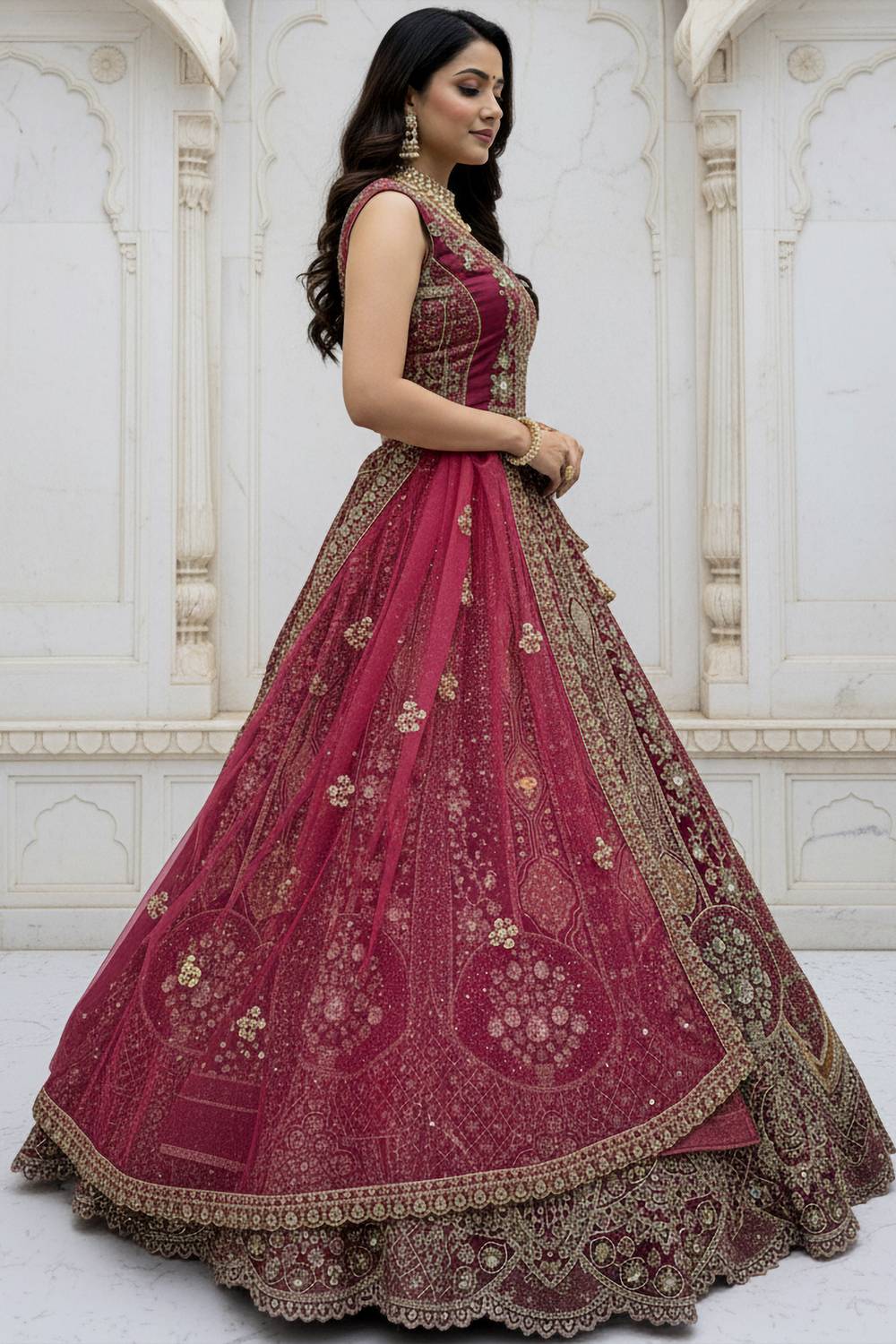 Step into the spotlight with our Lehenga a dazzling creation designed to make your special moments unforgettable. Crafted from premium Organza this lehenga offers a perfect combination of elegance and ease, keeping you graceful all day long. The exquisite Sequin with Stone Embossed makes this lehenga a masterpiece of traditional craftsmanship. Whether it’s Wedding, Reception or a grand celebration, this lehenga is the perfect choice to make a statement. Pair it with an ornate choker, a matching dupatta, and embellished stilettos to complete the regal look. Add a sleek bun or cascading curls for added glamour. Make every moment magical with the timeless allure of Lehenga