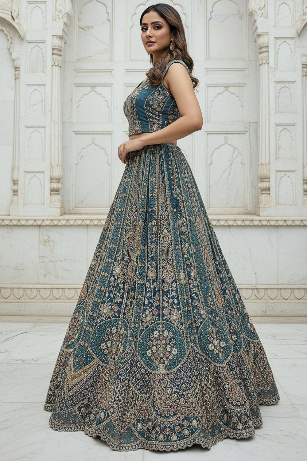Turquoise Sequin with Stone Embossed Organza Lehenga