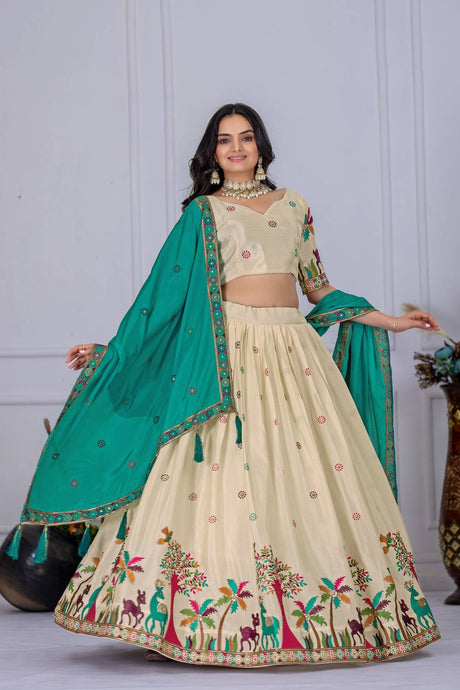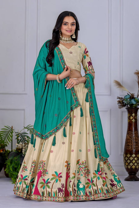 Green Floral Embroidered Lichi Fabric With Jacquard Border Lehenga
