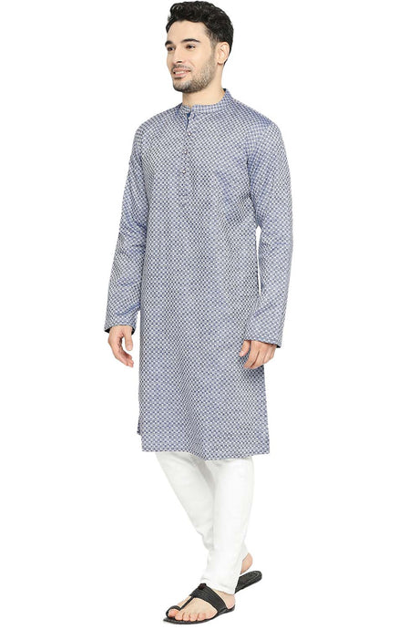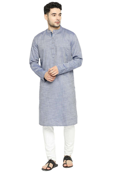 Men's Blue Cotton Mandarin Collar Long Kurta